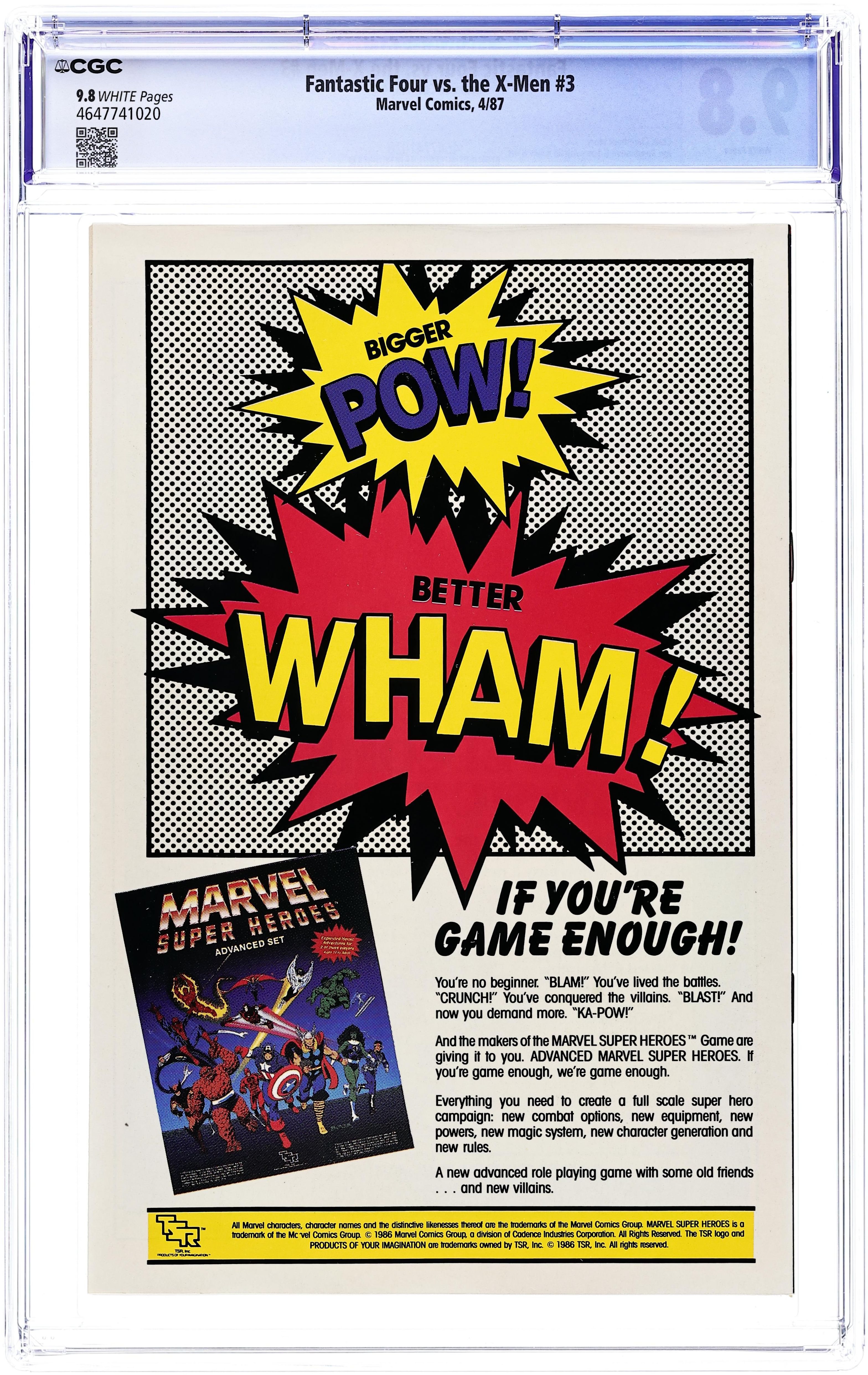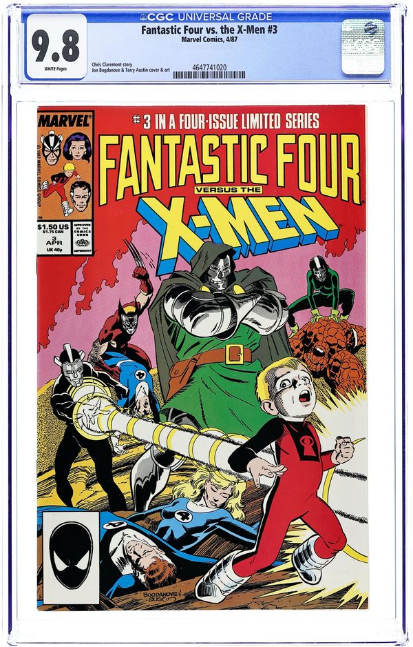 "A Matter of Faith!" Story by Chris Claremont. Art by Jon Bogdanove and Terry Austin. The Fantastic Four and the Uncanny X-Men face each other in a no holds barred battle. Can these heroes stop fighting each other long enough to save the life of Kitty Pryde before it's too late? Has Reed Richards lost the one thing that always separated him from his arch rival, his courage? Or has Doctor Doom finally triumphed over his hated enemies? This is it, the epic conclusion to a modern day classic. Cover price $1.50.