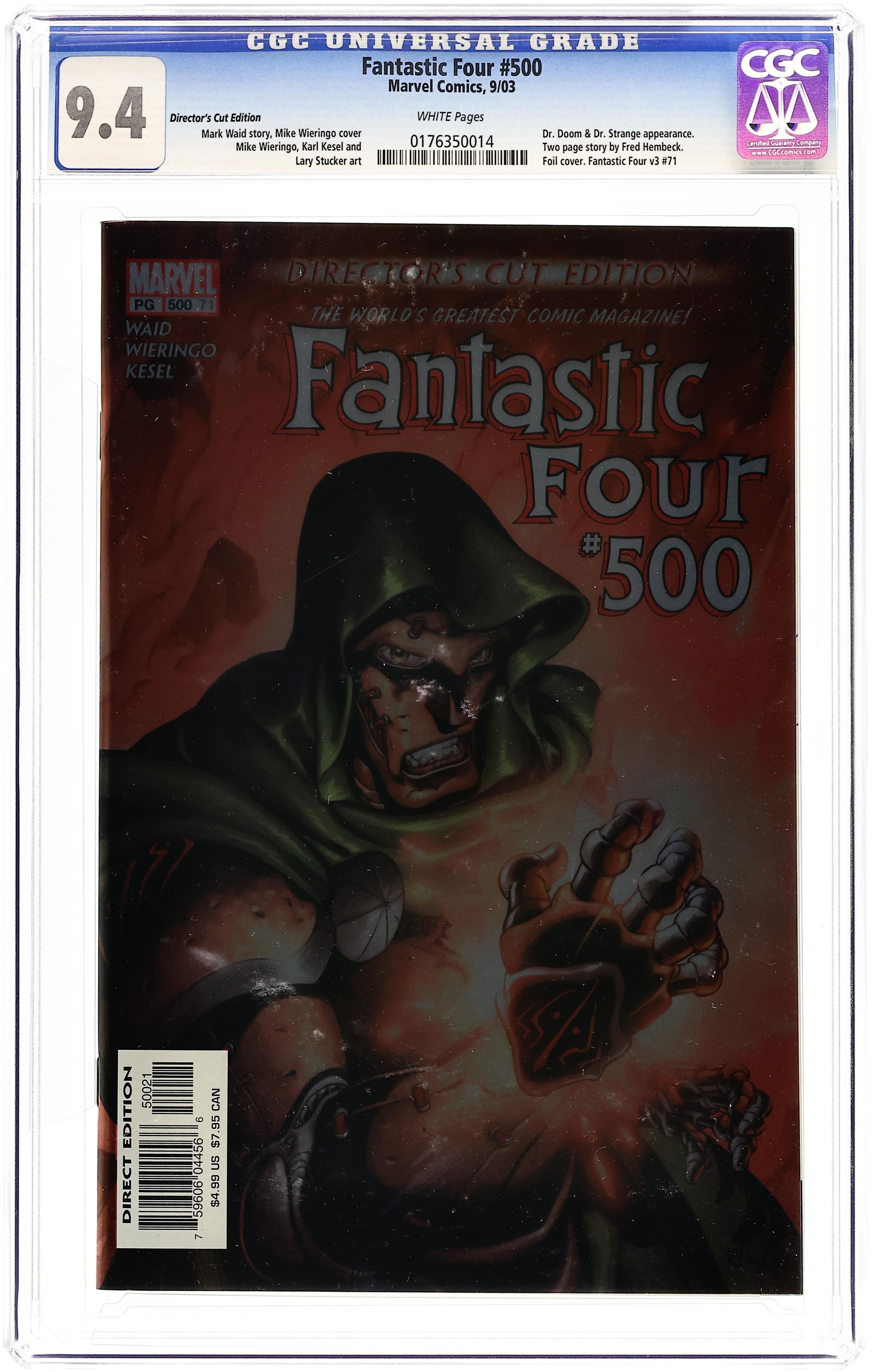 "Unthinkable Part 4" Written by Mark Waid. Pencils by Mike Wieringo. Inks by Karl Kesel and Lary Stucker. Cover by Mike Wieringo, Karl Kesel, and Richard Isanove. A special extra-sized edition of the World's Greatest Comic Magazine's 500th issue! Features the full standard edition, plus a special foil-enhanced cover and 16-pages of DVD-style extras, including: deleted scenes, creator commentaries, outtakes, and bonus material celebrating 500 issues of Marvel's flagship series! Note: Marvel celebrated its first series to reach 500 issues by returning FANTASTIC FOUR to its original numbering! Cover price $4.99.