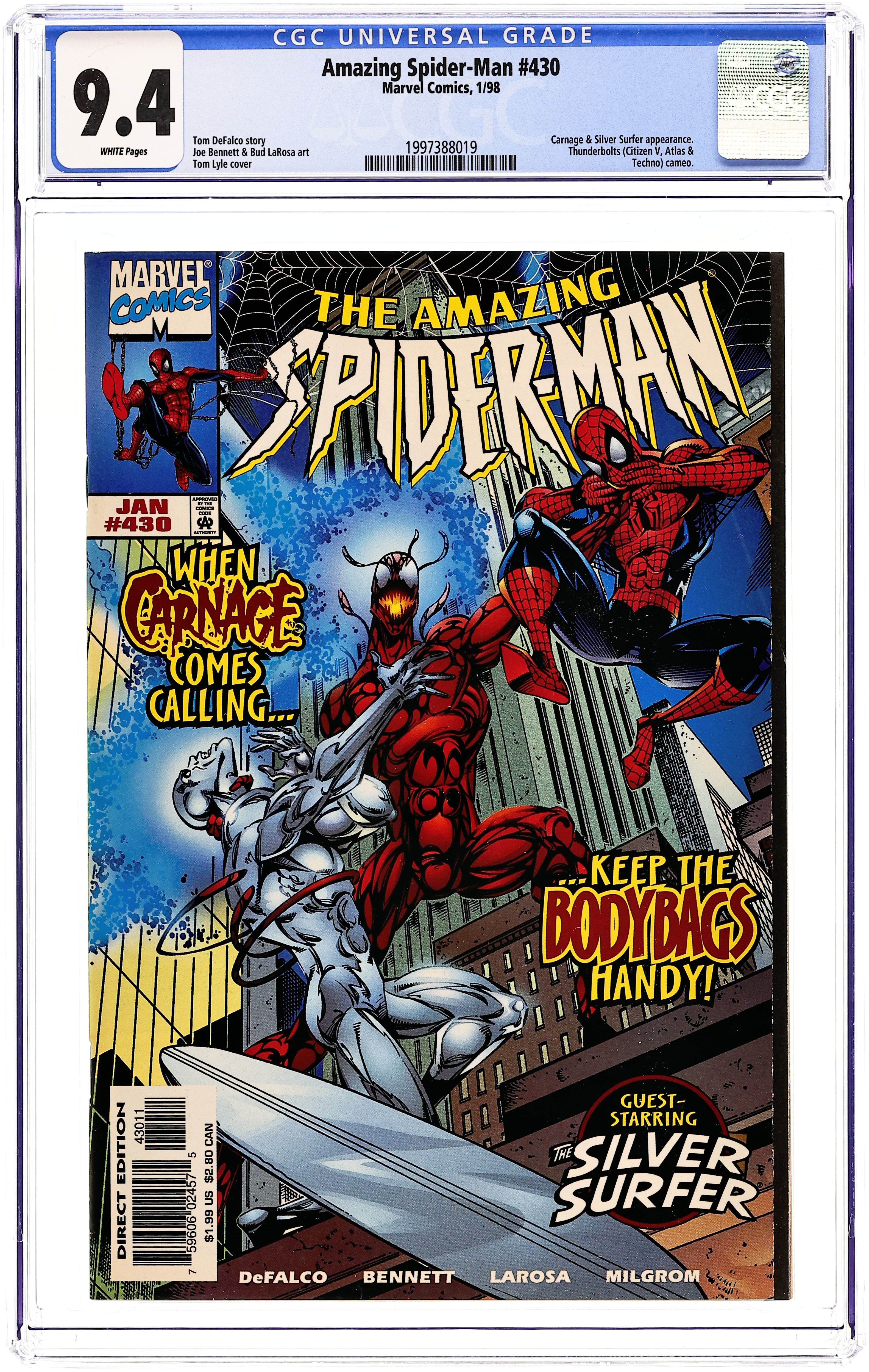 Direct Edition. Cover pencils by Tom Lyle, inks by Bud LaRosa. Carnage and the Silver Surfer guest star in "Savage Rebirth!", script by Tom DeFalco, pencils by Joe Bennett, inks by Bud LaRosa; Spider-Man rejoices that the Avengers have been confirmed to be alive; He begins dealing with the one million dollar reward the Bugle has on him; He heads toward the Baxter Building to visit the Fantastic Four, only to remember that the Thunder Bolts recently purchased the building; Peter agrees to quit being Spider-Man, as Mary meets up with Jill; Dr. Ashley Kafka, the new director of the Ravencroft Institute wants to shut down the microwave field holding back Cletus Kasady in order to cut costs. Cameos by Captain America, Iron Man, and the Vision. 38 pgs., full color. $1.99. Cover price $1.99.