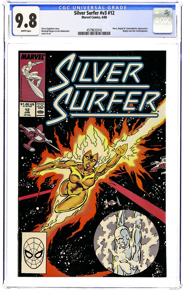 Direct Edition. "Heaven!" Firebird cameo. Story by Steve Englehart. Art by Marshall Rogers and Joe Rubinstein. Story picks up after West Coast Avengers Annual #2 and Avengers Annual #16. Empowered with the Power Cosmic the Silver Surfer is one of the most powerful beings in the Marvel Universe. However, there exist beings whose powers rival and in some instances surpass even those of a former Herald of Galactus. When the Elders of the Universe decide the Surfer has become a liability to their plot, they dispatch one of their own to deal with him. 32 pages. Cover price $0.75.