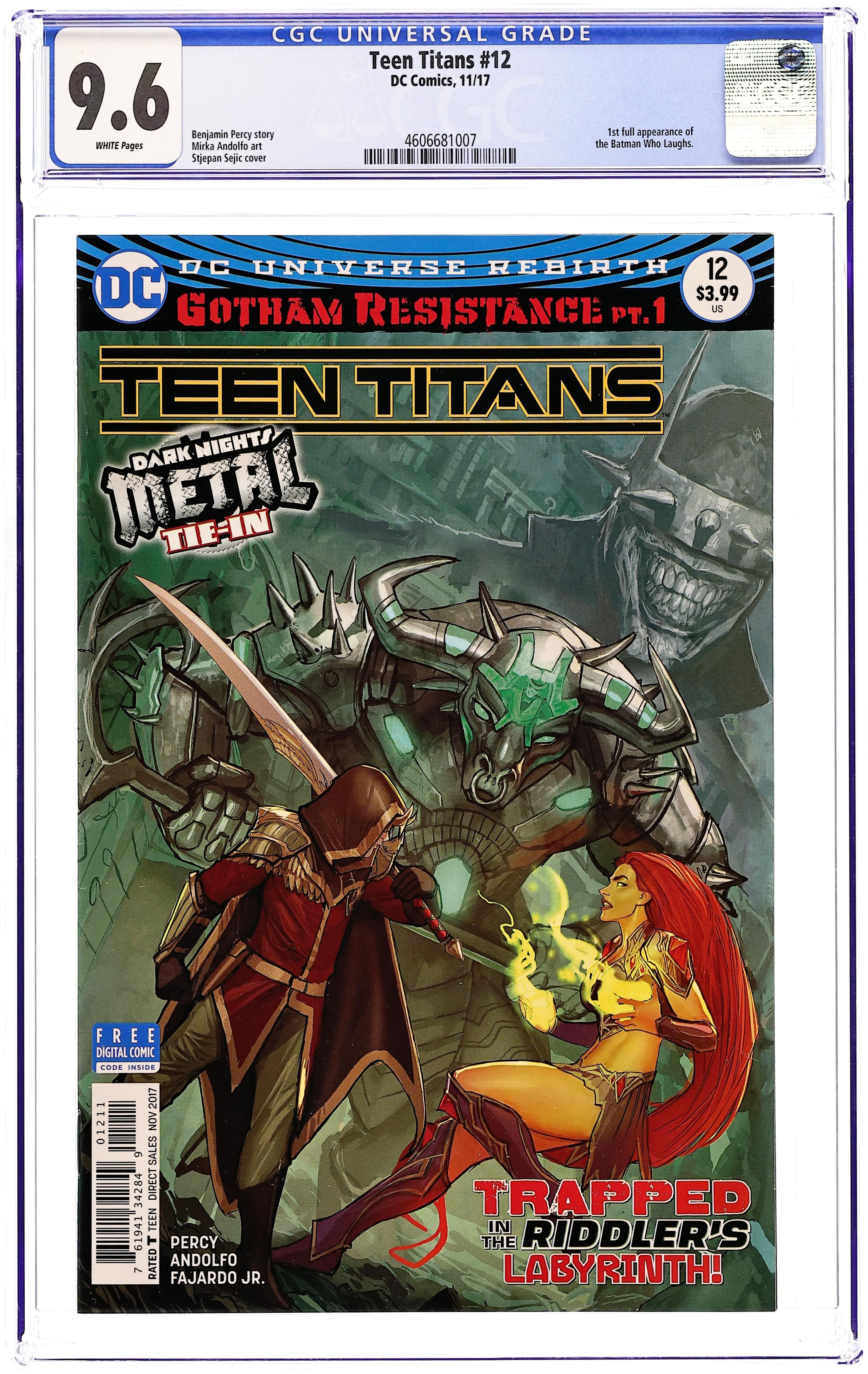 2nd Printing. Written by Ben Percy. Art by Mirka Andolfo. Cover by Stjepan Sejic. A DARK NIGHTS: METAL tie-in! 'GOTHAM RESISTANCE' part one! The fight for Gotham City's soul starts here! When Robin receives a distress call from Nightwing urging him to return home, he discovers that Gotham City has been transformed into a mosaic of monsters, magic and doom! Trapped inside the Riddler's deadly maze with nowhere to turn, Robin soon assembles an unlikely team of hometown heroes including Batgirl, Harley Quinn, Killer Croc, Black Canary and Green Arrow to find the missing Nightwing and save their city! 32 pages, full color. Rated T Cover price $3.99.