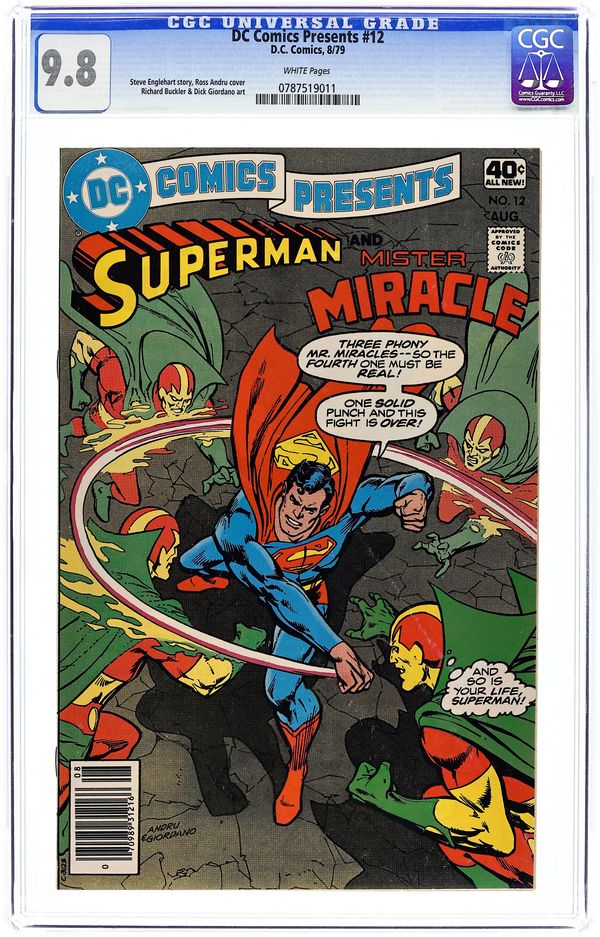Winner Take Metropolis - Written by Steve Englehart. Art by Rich Buckler and Dick Giordano. Cover by Ross Andru and Dick Giordano. Why is Mister Miracle trying to outdo and outclass Superman and why does he want Superman to face him in a battle of the super stars? Characters in this issue: Superman; Mister Miracle; Lola Barnett; Big Barda; Oberon; Highfather (flashback); Carolyn Dole; Jimmy Olsen; Johnny Nevada (on TV); Lana Lang (on TV); Intergang [Xugat (villain)]. 32 pages, full color. Cover price $0.40.