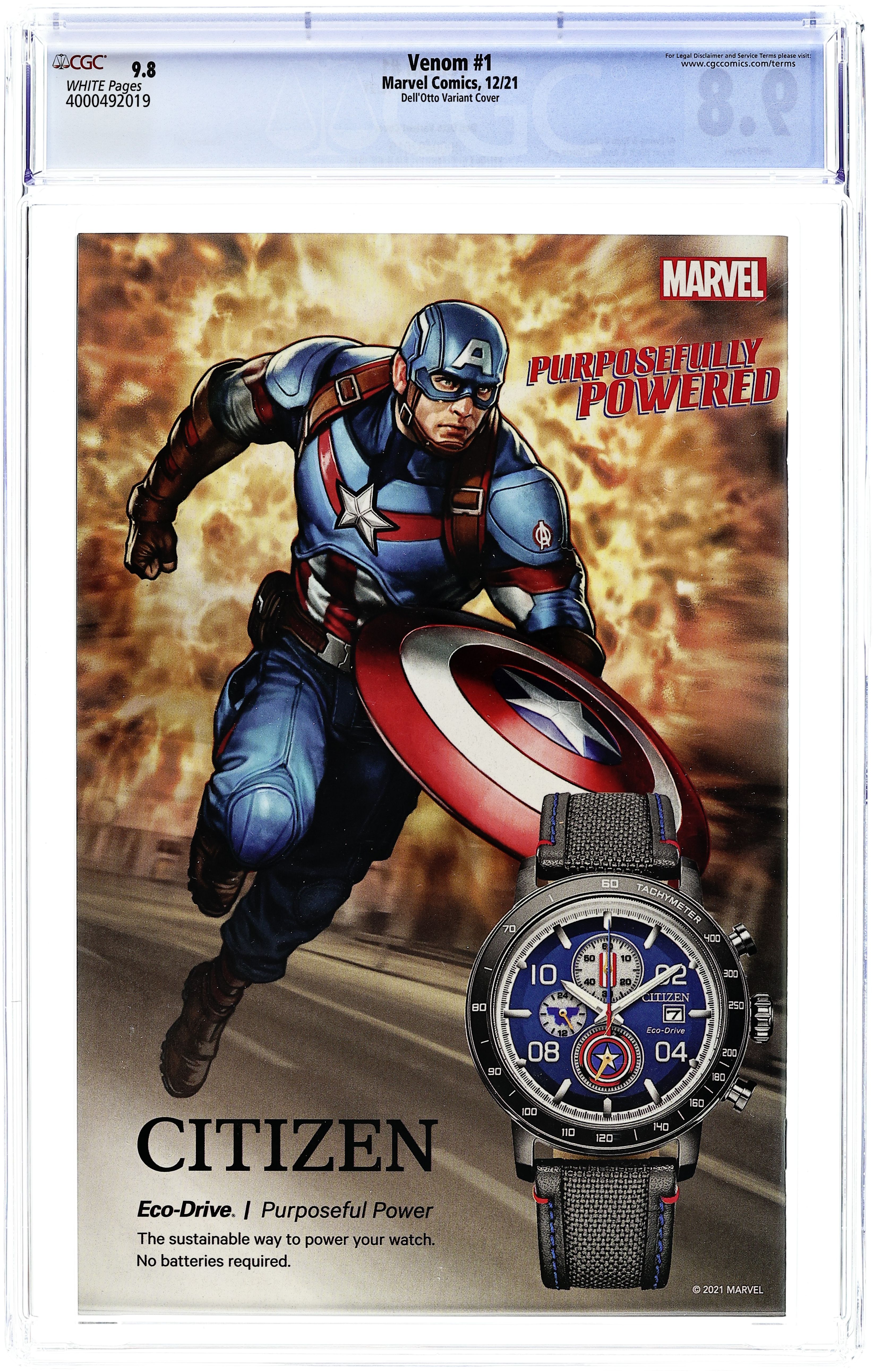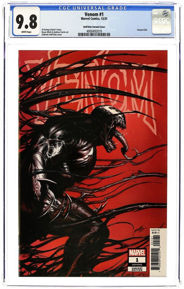 Written by Al Ewing and Ram V. Art by Bryan Hitch. Cover by Gabriele Dell'Otto. AN EPIC NEW ERA FOR THE SINISTER SYMBIOTE STARTS HERE! Hot off the heels of VENOM #200 and EXTREME CARNAGE, we're closing out 2021 with one of the most ambitious books in symbiote history - an all-new VENOM from some of comics' greatest talents! Marvel mainstay AL EWING, who himself has just ended a character-redefining run on IMMORTAL HULK, is being joined by RAM V, a horror maestro all his own, to craft a mind-bending and gut-wrenching tale of symbiosis the likes of which the Marvel Universe has never seen! AS IF THAT WASN'T ENOUGH, they've been joined by industry legend BRYAN HITCH, who is leaving IT ALL ON THE PAGE! We haven't led you astray yet, have we? So trust us when we tell you that you have NEVER seen a VENOM like this! 52 pages, full color. RATED T+ Cover price $5.99.
