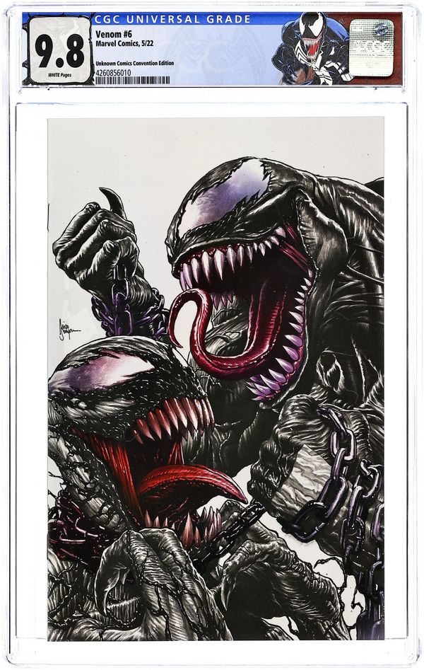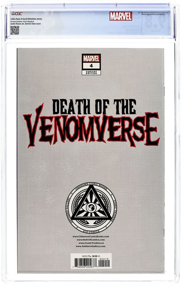 Comics Illuminati (Unknown Comics, Comic Traders, Anti-Hero Gallery, and The 616 Comics) Exclusive Cover by Derrick Chew. Written by Cullen Bunn; David Michelinie, Taigami. Art by Gerardo Sandoval; Justin Mason, Taigami. CARNAGE UNLEASHED! CARNAGE continues his savage rampage throughout the Multiverse, obliterating as many VENOMS as he can! Do AGENT VENOM and what's left of her team even stand a chance? Or is Carnage destined to win? 36 pages, full color. Rated T+