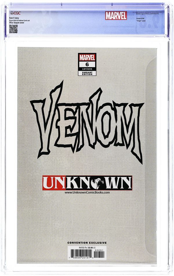 Comics Illuminati (Unknown Comics, Street Level Hero, and Comic Traders) exclusive Virgin cover by Marco Mastrazzo. Written by Al Ewing and Ram V. Art by Bryan Hitch. AN EPIC NEW ERA FOR THE SINISTER SYMBIOTE STARTS HERE! Hot off the heels of VENOM #200 and EXTREME CARNAGE, we're closing out 2021 with one of the most ambitious books in symbiote history - an all-new VENOM from some of comics' greatest talents! Marvel mainstay AL EWING, who himself has just ended a character-redefining run on IMMORTAL HULK, is being joined by RAM V, a horror maestro all his own, to craft a mind-bending and gut-wrenching tale of symbiosis the likes of which the Marvel Universe has never seen! AS IF THAT WASN'T ENOUGH, they've been joined by industry legend BRYAN HITCH, who is leaving IT ALL ON THE PAGE! We haven't led you astray yet, have we? So trust us when we tell you that you have NEVER seen a VENOM like this! 52 pages, full color. RATED T+