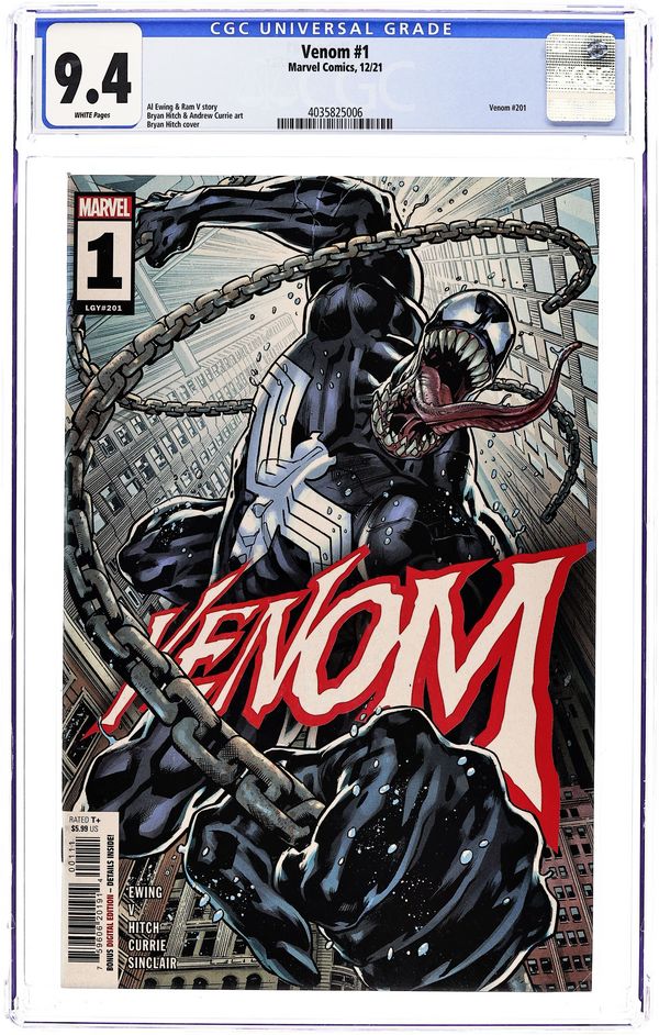 Written by Al Ewing and Ram V. Art and Cover by Bryan Hitch. AN EPIC NEW ERA FOR THE SINISTER SYMBIOTE STARTS HERE! Hot off the heels of VENOM #200 and EXTREME CARNAGE, we're closing out 2021 with one of the most ambitious books in symbiote history - an all-new VENOM from some of comics' greatest talents! Marvel mainstay AL EWING, who himself has just ended a character-redefining run on IMMORTAL HULK, is being joined by RAM V, a horror maestro all his own, to craft a mind-bending and gut-wrenching tale of symbiosis the likes of which the Marvel Universe has never seen! AS IF THAT WASN'T ENOUGH, they've been joined by industry legend BRYAN HITCH, who is leaving IT ALL ON THE PAGE! We haven't led you astray yet, have we? So trust us when we tell you that you have NEVER seen a VENOM like this! 60 pages, full color. RATED T+ Cover price $5.99.