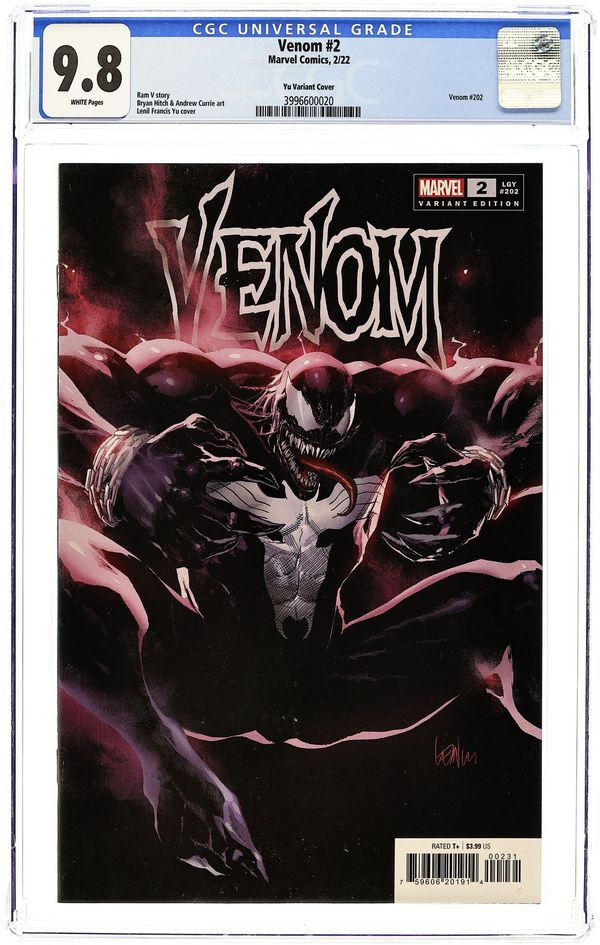 Limited 1 for 25 Retailer Incentive Variant Cover. Written by Ram V. Art by Bryan Hitch. Cover by Leinil Francis Yu. The tour de force of comics awesomeness brought to you by the dynamite new creative team on VENOM continues! VENOM #1 shocked, intrigued and terrified you! With Ram V and Al Ewing weaving a mind-bending story that will push Eddie and Dylan Brock to their limits, and Bryan Hitch doing some of the most action-packed work of his career, VENOM #2 will do all that AND MORE! 28 pages, full color. Rated T+ Cover price $3.99.