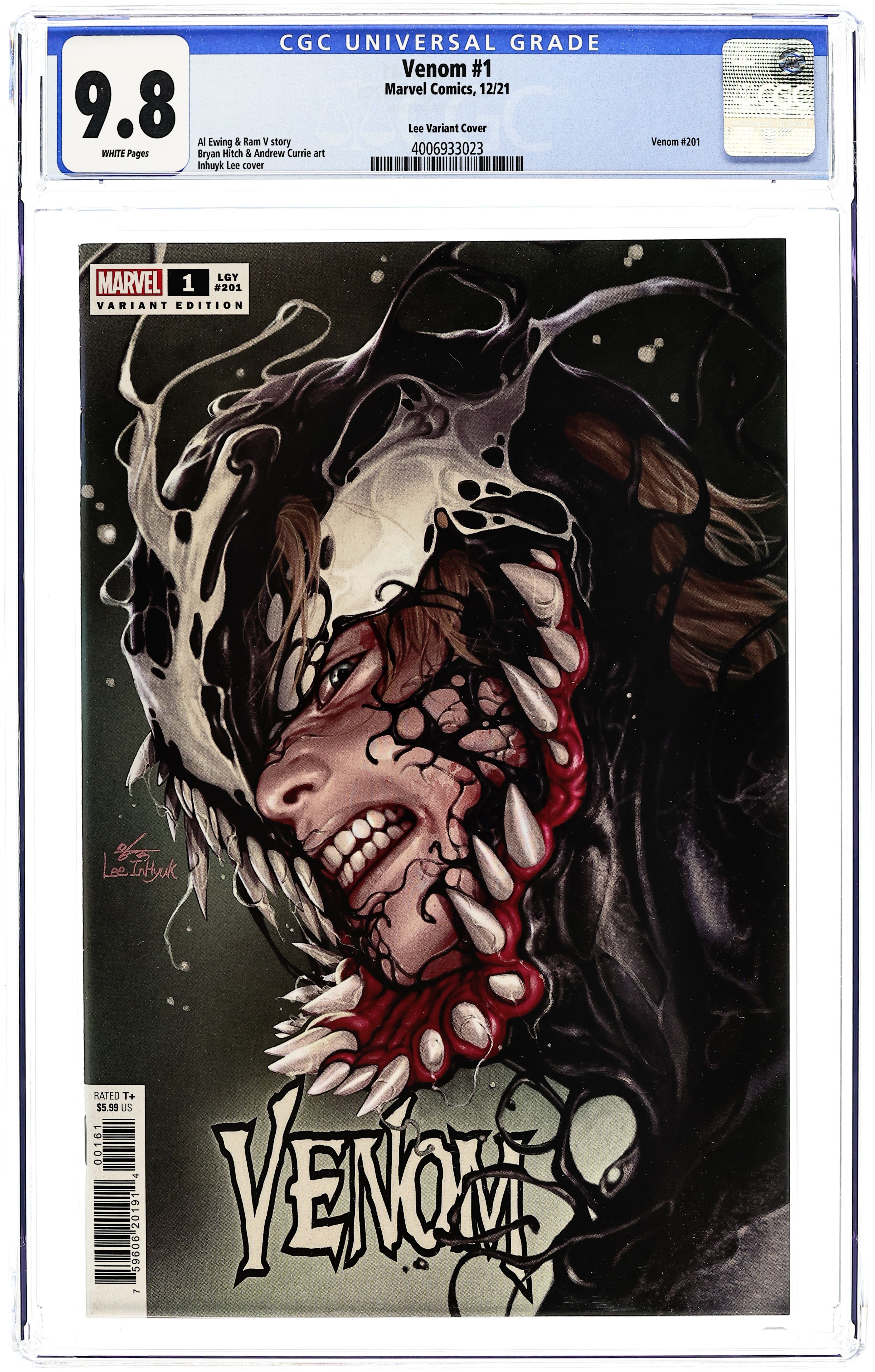 Written by Al Ewing and Ram V. Art by Bryan Hitch. Cover by Inhyuk Lee. AN EPIC NEW ERA FOR THE SINISTER SYMBIOTE STARTS HERE! Hot off the heels of VENOM #200 and EXTREME CARNAGE, we're closing out 2021 with one of the most ambitious books in symbiote history - an all-new VENOM from some of comics' greatest talents! Marvel mainstay AL EWING, who himself has just ended a character-redefining run on IMMORTAL HULK, is being joined by RAM V, a horror maestro all his own, to craft a mind-bending and gut-wrenching tale of symbiosis the likes of which the Marvel Universe has never seen! AS IF THAT WASN'T ENOUGH, they've been joined by industry legend BRYAN HITCH, who is leaving IT ALL ON THE PAGE! We haven't led you astray yet, have we? So trust us when we tell you that you have NEVER seen a VENOM like this! 52 pages, full color. RATED T+ Cover price $5.99.