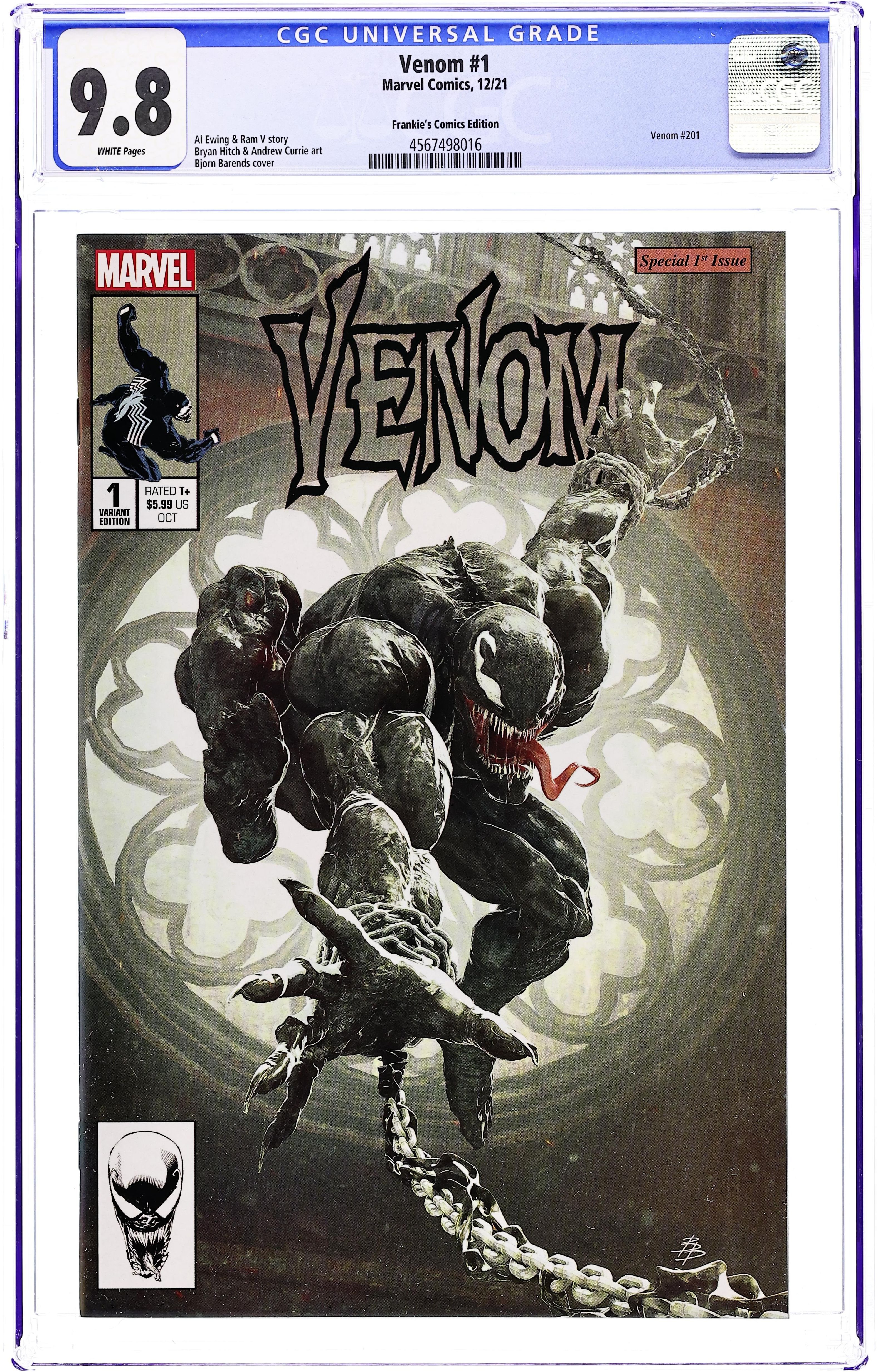 Frankie's Comics Exclusive Variant Cover by Bjorn Barends. Written by Al Ewing and Ram V. Art by Bryan Hitch. AN EPIC NEW ERA FOR THE SINISTER SYMBIOTE STARTS HERE! Hot off the heels of VENOM #200 and EXTREME CARNAGE, we're closing out 2021 with one of the most ambitious books in symbiote history - an all-new VENOM from some of comics' greatest talents! Marvel mainstay AL EWING, who himself has just ended a character-redefining run on IMMORTAL HULK, is being joined by RAM V, a horror maestro all his own, to craft a mind-bending and gut-wrenching tale of symbiosis the likes of which the Marvel Universe has never seen! AS IF THAT WASN'T ENOUGH, they've been joined by industry legend BRYAN HITCH, who is leaving IT ALL ON THE PAGE! We haven't led you astray yet, have we? So trust us when we tell you that you have NEVER seen a VENOM like this! 52 pages, full color. RATED T+