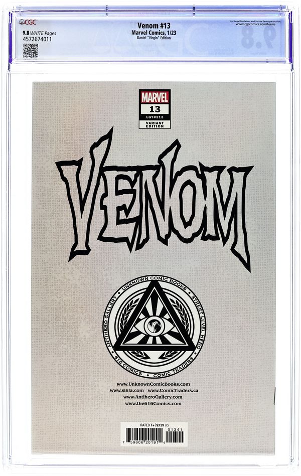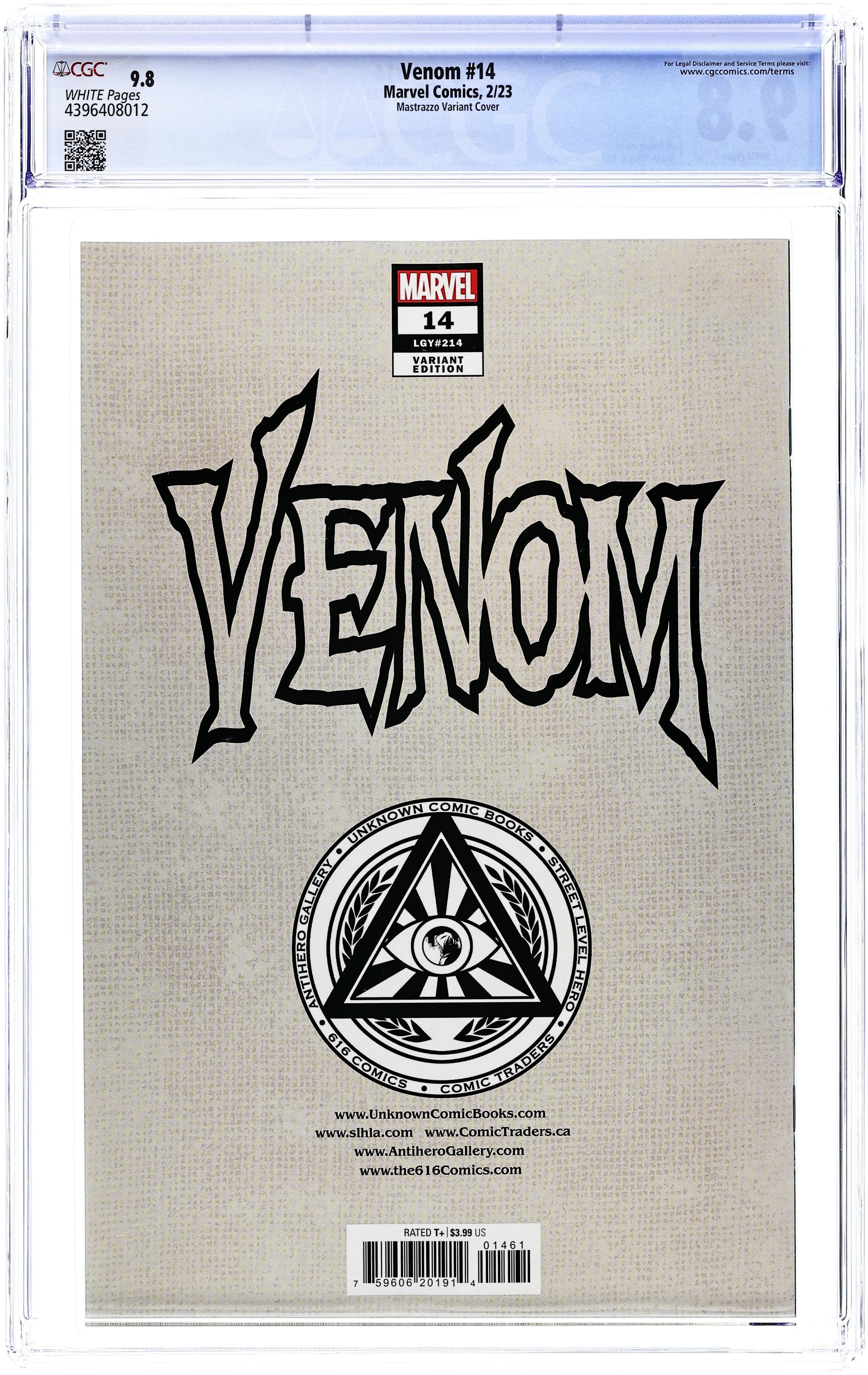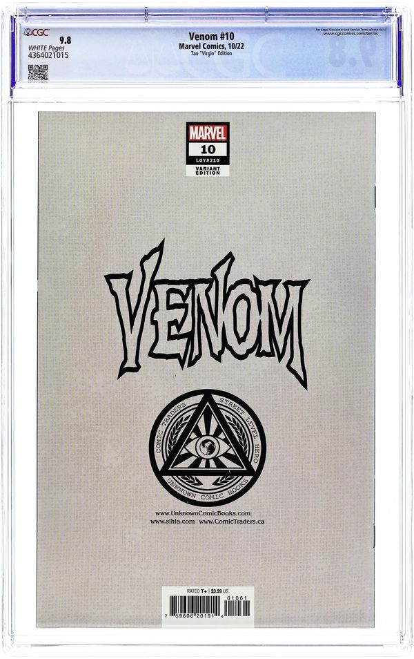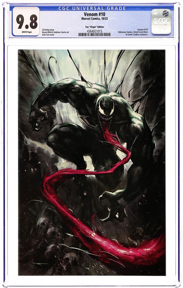 Comics Illuminati (Unknown Comics, Street Level Hero, and Comic Traders) exclusive Virgin Cover by Ivan Tao. Written by Al Ewing. Art by Bryan Hitch. THE COLOSSAL CAPSTONE TO THE SECOND ARC OF THIS EPIC NEW ERA OF VENOM! Torn across space and time through the symbiote hive, Eddie Brock's soul is pushed to its absolute limit! Manipulated and maligned by forces stronger than himself, Eddie has no choice but to watch in horror as his son, Dylan, and the Venom symbiote are stabbed in the heart by BEDLAM! 28 pages, full color. Rated T+