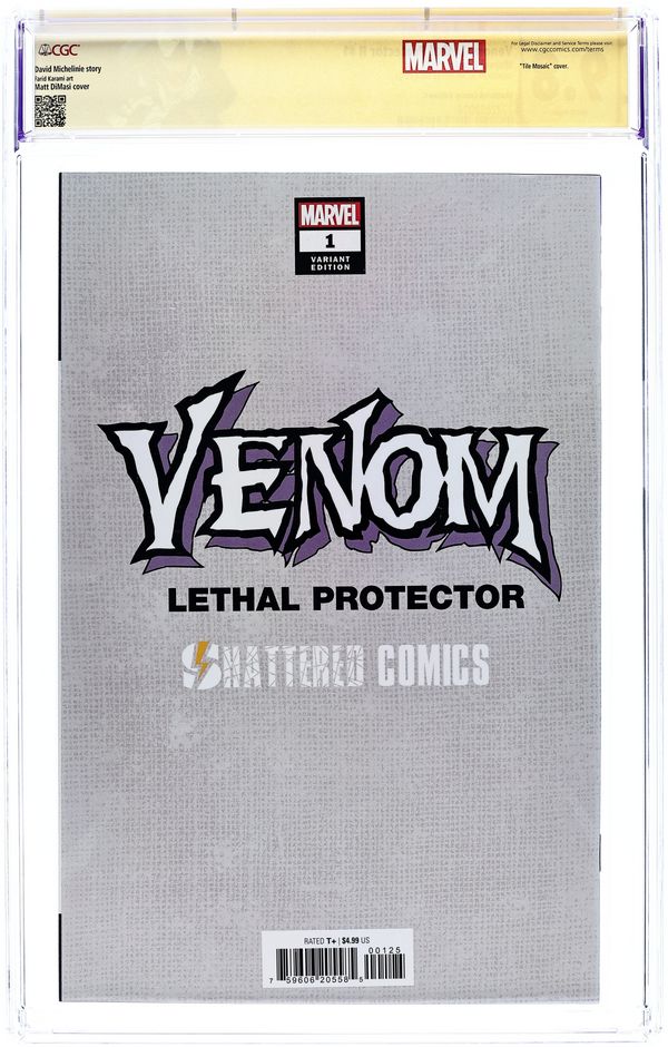 Shattered Comics Exclusive Black Tile Mosaic Cover by Matt DiMasi. Written by David Michelinie. Art by Farid Karami. BROCK VS. DOOM. 'NUFF SAID! Venom co-creator DAVID MICHELINIE returns with a brand-new story set in the sinister symbiote's past when brains - and Spider-Man - were still on the menu! This time, he's uniting with rising star FARID KARAMI to weave an epic, blockbuster story that will take Venom from the streets of NYC to the kingdom of Latveria as EDDIE BROCK is challenged like never before! What (or WHO) will Venom need to overcome the fiercest foe in the Marvel U? One thing's for certain, this monster's bringing the mayhem! 40 pages, full color. Rated Teen+ Cover price $4.99.