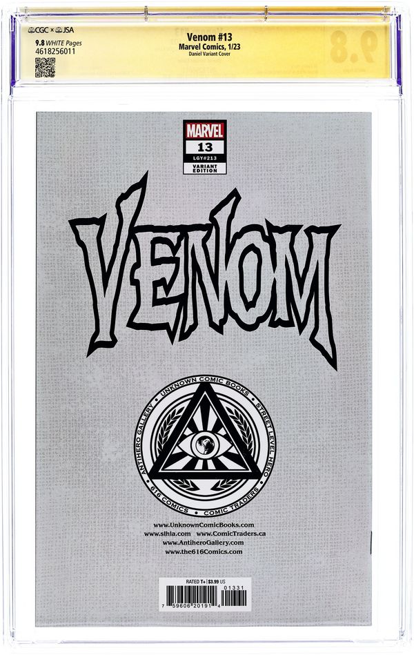 Comics Illuminati (Unknown Comics, Street Level Hero, and Comic Traders) Exclusive Virgin Cover by Sabine Rich. Written by Al Ewing; RAM V. Art by Bryan Hitch. EDDIE BROCK, AL EWING & BRYAN HITCH UNITE FOR A TALE ACROSS TIME! Eddie Brock is still getting used to his place in the symbiote hive, and with new allies and familiar faces alike offering him advice along the way, Eddie remains as canny, wary and reckless as ever. Little does he know, his battle across the cosmos has only just begun, and KANG THE CONQUERER has a front-row seat for its first act! 28 pages, full color. Rated T+