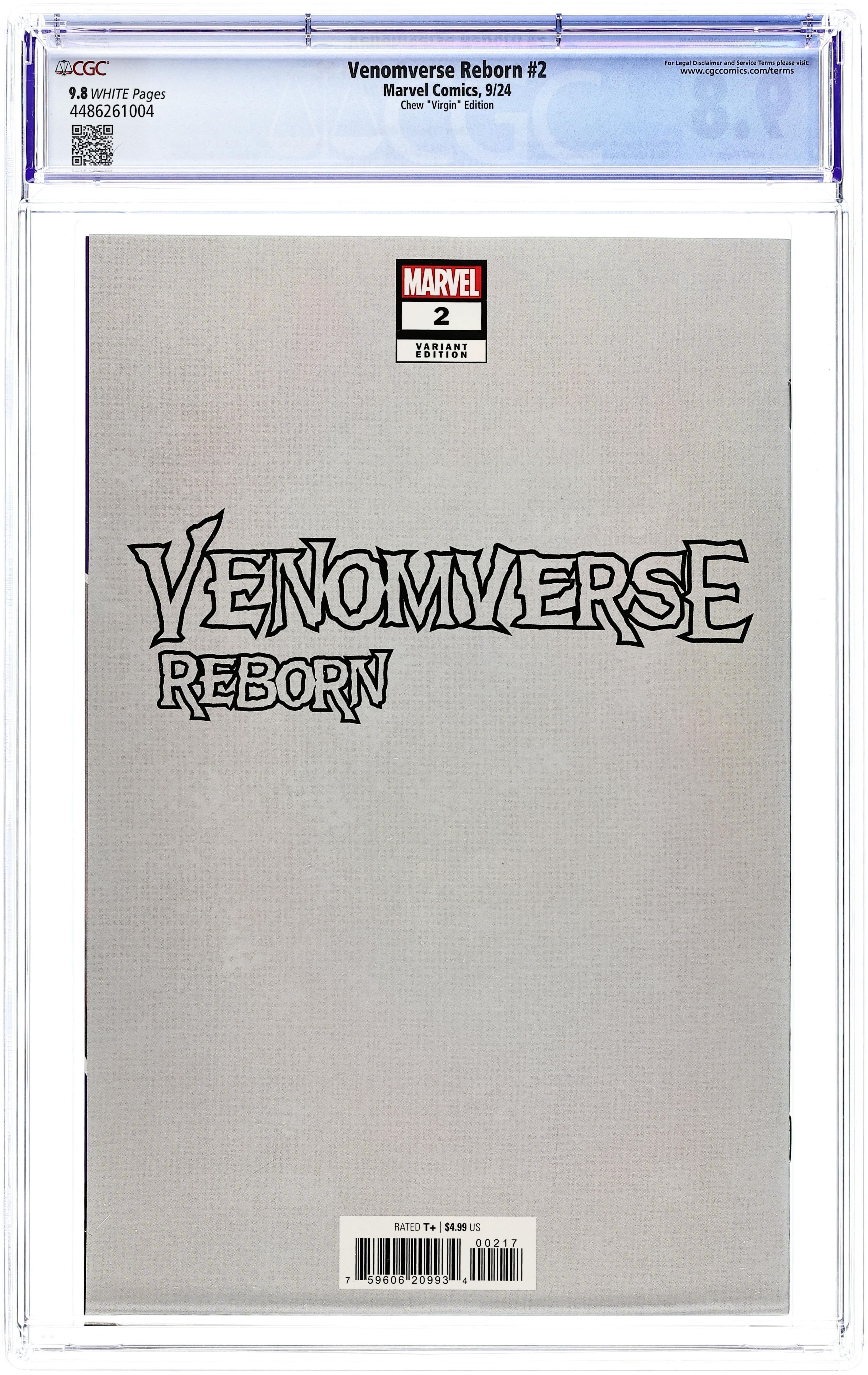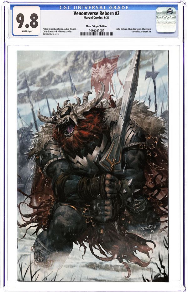 Limited 1 for 100 Retailer Incentive Variant Cover. Written by Phillip Kennedy Johnson and Adam Warren. Art by John McCrea, Chriscross. Cover by Derrick Chew. ACROSS THE VENOMVERSE! Symbiotes have long taken hosts all over the multiverse, and this issue brings a mix of the all-new with the returning favorites! First up, Phillip Kennedy Johnson brings us a brutal take on Venom born in the age of Vikings! Then, Adam Warren brings us the return of the final biological life in his universe, the Venom of Venom: The End! Plus, Chris Giarrusso brings us a tale of Mini-Marvels Venom! And of course, it's all framed up by current Venom mastermind Al Ewing with artist Danilo S. Beyruth! 32 pages, full color. Rated T+ Cover price $4.99.