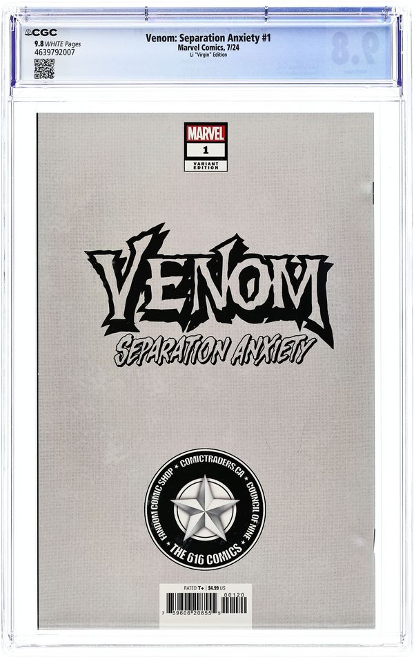 Comics Syndicate (Comic Traders, Fandom Comic Shop, The 616 Comics, and Council of Nine) Exclusive Virgin Cover by Leirix Li. Written by David Michelinie. Art by Gerardo Sandoval. LONG LIVE…THE KING IN PURPLE! AMAZING SPIDER-MAN legend and VENOM co-creator DAVID MICHELINIE triumphantly returns to tell another all-new, heart-pounding, brain-eating tale set in EDDIE BROCK'S earliest days! This time, he's teaming up with VENOM and DEATH OF THE VENOMVERSE artist extraordinaire GERARDO SANDOVAL! Venom has made a new enemy. And their bond will be tested like never before when a foe with the power to alter reality itself threatens to tear Eddie's world apart, starting with his symbiote! 36 pages, full color. Rated T+ Cover price $4.99.