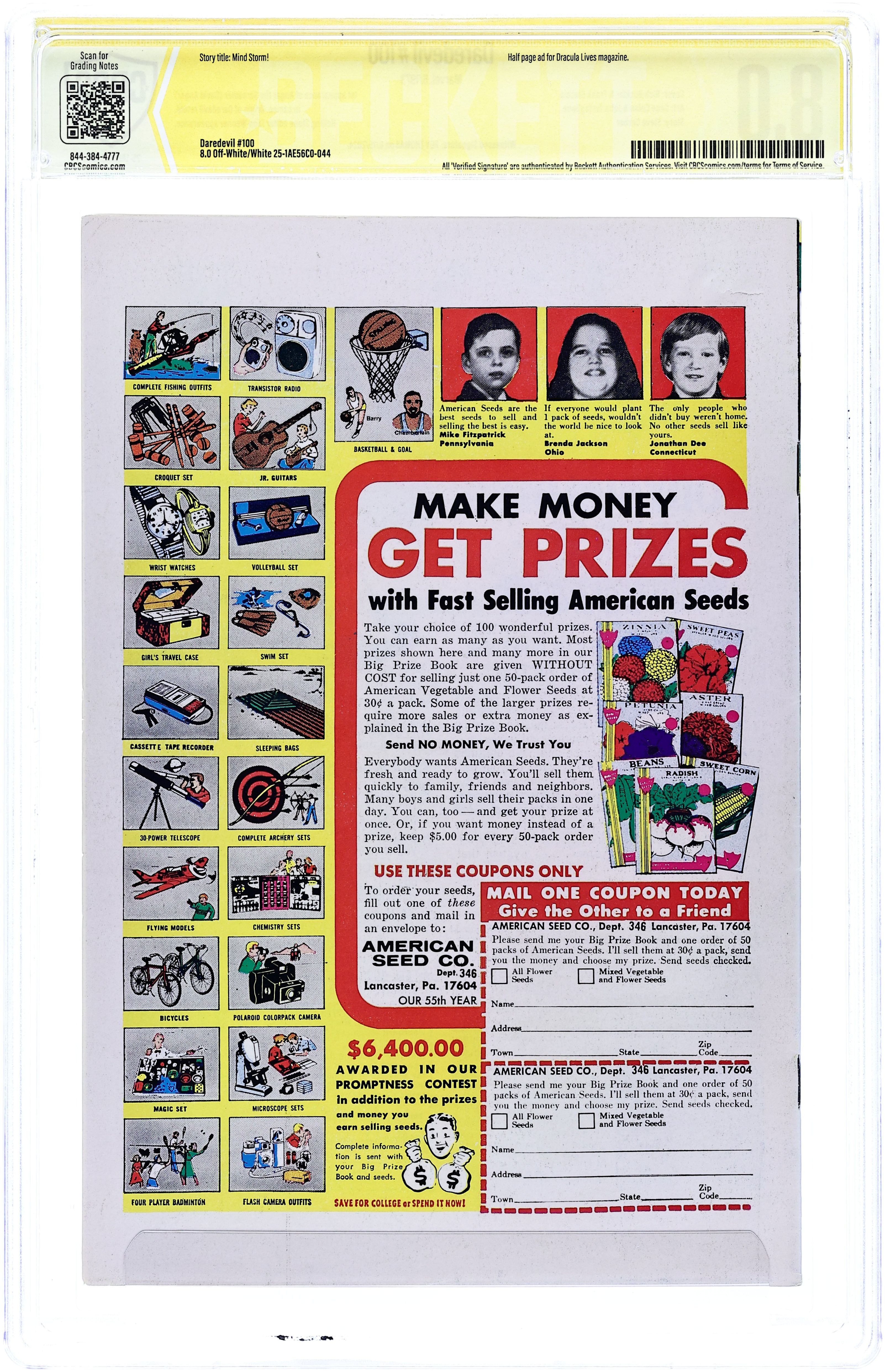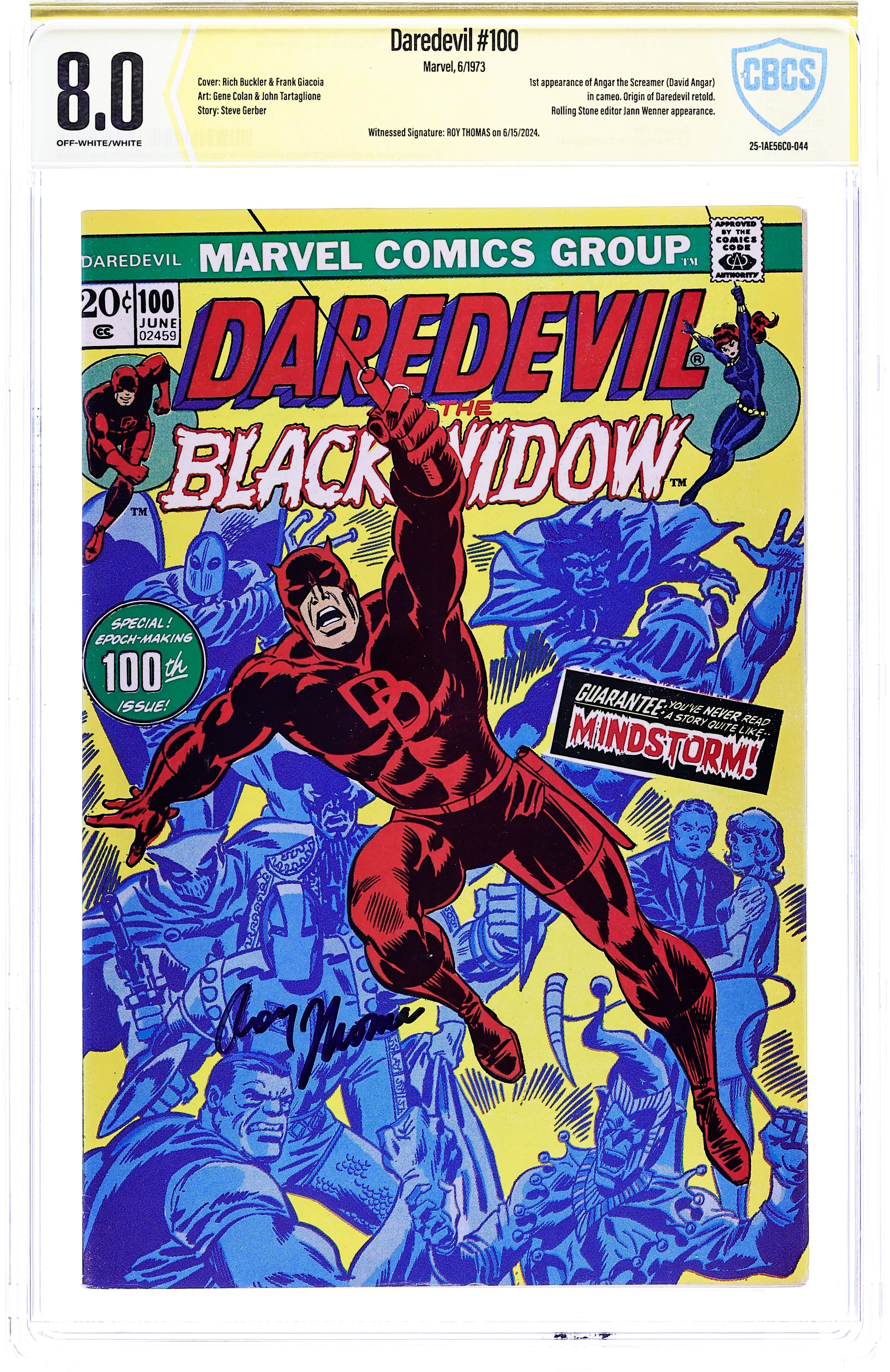 Cover pencils by Rich Buckler, inks by Frank Giacoia. First appearance of Angar the Screamer in Mind Storm!, script by Steve Gerber, pencils by Gene Colan, inks by John Tartaglione; Daredevil returns to San Fran in time to give an impromptu interview to Rolling Stone Magazine during which the whole world goes nuts; Angar shows up to claim responsibility; Daredevil origin retold; appearance by Jann Wenner (editor of Rolling Stone magazine); cameos by the Jester, Leap-Frog, the Matador, Tagak, Doctor Doom, the Gladiator, the Black Widow, Mike Murdock, and a John Lennon poster. 36 pages. Cover price $0.20. Cover price $0.20.