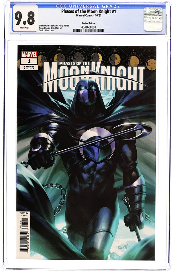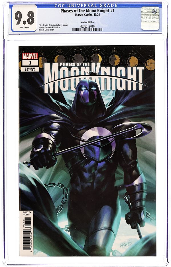 Written by Benjamin Percy; Erica Schultz. Art by Manuel Garcia; Rod Reis. Cover by Derrick Chew. ILLUMINATING LOST LUNAR LORE! Though he is among the most recent, Marc Spector is far from the first FIST OF KHONSHU! The true history and depth of the legacy of the Moon Knight has been shrouded in the mystery of antiquity…UNTIL NOW! Featuring an awesome assembly of creators from across the industry, PHASES OF THE MOON KNIGHT begins with a story of the Moon Knight you know as he enacts his unique and violent vision of justice! PLUS! An all-new Moon Knight from the Marvel Universe's ancient past: the Moon Knight of the Old Crusades! Forged in the crucible of a holy war, what long-forgotten secrets of the Marvel Universe are waiting to be discovered in his saga?! 40 pages, full color. Rated T+ Cover price $4.99.