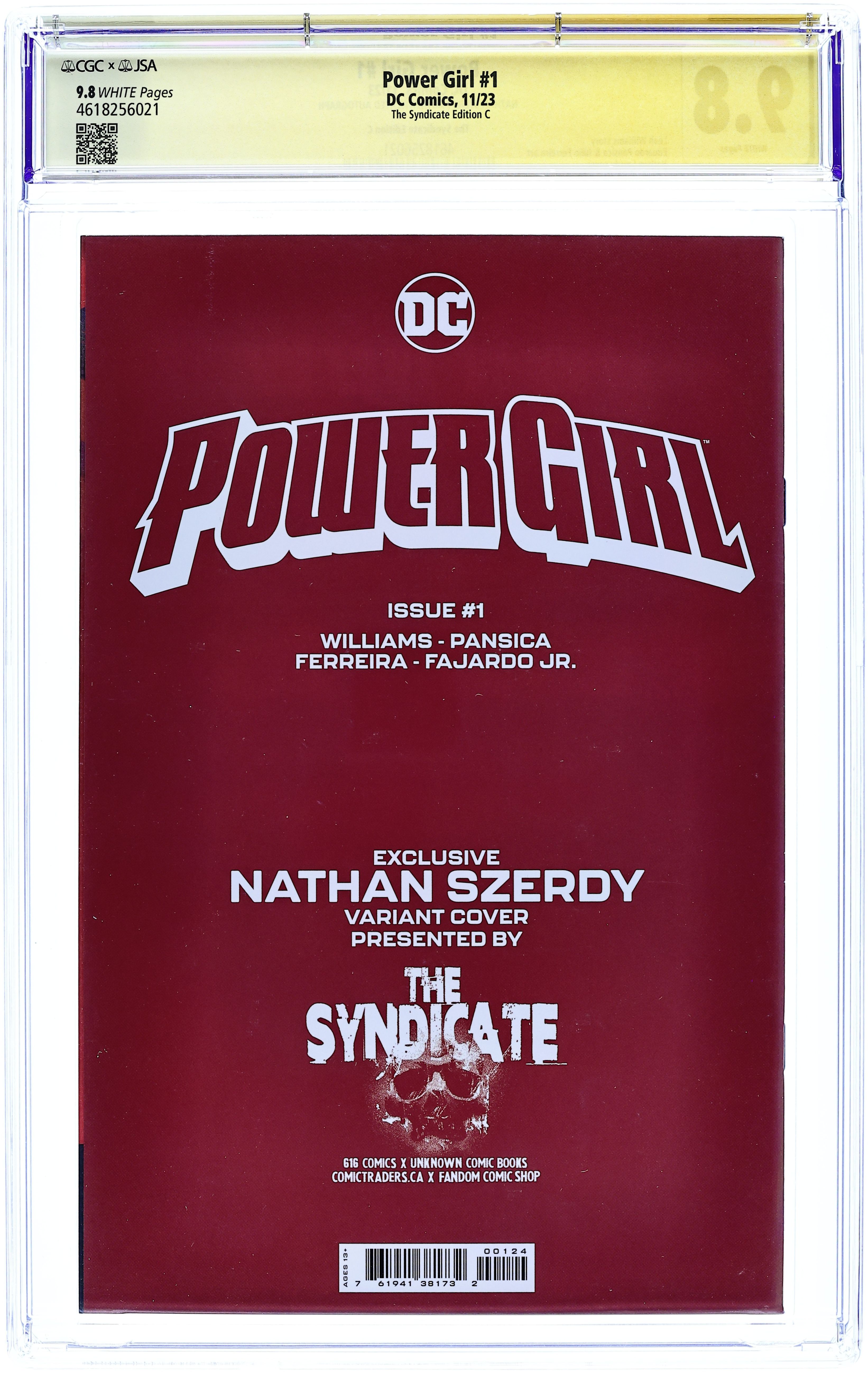The Syndicate (The 616 Comics, Unknown Comics, Comic Traders, and Fandom Comic Shop) Exclusive Cover by Nathan Szerdy. Written by Leah Williams. Art by Eduardo Pansica, Julio Ferreira. PRETTY, PUNCHY, AND POWERFUL! After the events of Knight Terrors, a long-dormant Kryptonian threat has returned to take down Superman and his family. Who could possibly stop it? Well, according to the Man of Steel, its Power Girl! Witness a road trip race against time as Paige reconnects with her roots to save the world from her deadly past. Power Girl Special writer Leah Williams returns with artist Eduardo Pansica (Supergirl) for an ongoing series of epic proportions! 32 pages, full color. Rated T+