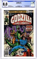 Newsstand Edition. Final issue. "And Lo, A Child Shall Lead Them!" Part 8 of 8. Guest-starring the Avengers and Fantastic Four. Spider-Man cameo. Story by Doug Moench. Art by Herb Trimpe and Dan Green. Godzilla's epic American Tour comes to an earth shattering end. Can the combined might of the Avengers, Fantastic Four, and S.H.I.E.L.D. hope to contain this titanic beast before he destroys the Big Apple, or will they have to finally use lethal force to bring the beast down? This is it, the final farewell for Godzilla, King of the Monsters. Cover price $0.40.