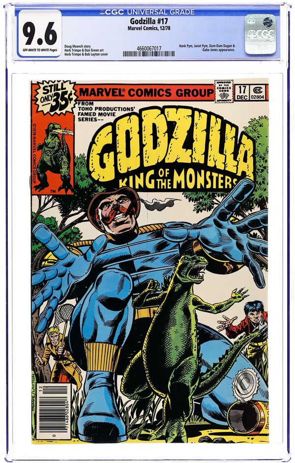 "Of Lizards, Great and Small!" Part 1 of 8. Guest-starring Hank Pym (Giant Man) and the Wasp. Story by Doug Moench. Art by Herb Trimpe and Dan Green. This issue begins the most offbeat epic in Godzilla's history. Tired of getting his butt kicked by the giant lizard, S.H.I.E.L.D. agent Dum-Dum Dugan calls in the Avengers for some much needed help. Using Pym Particles, they shrink the mighty leviathan down to a manageable size. Cover price $0.35.