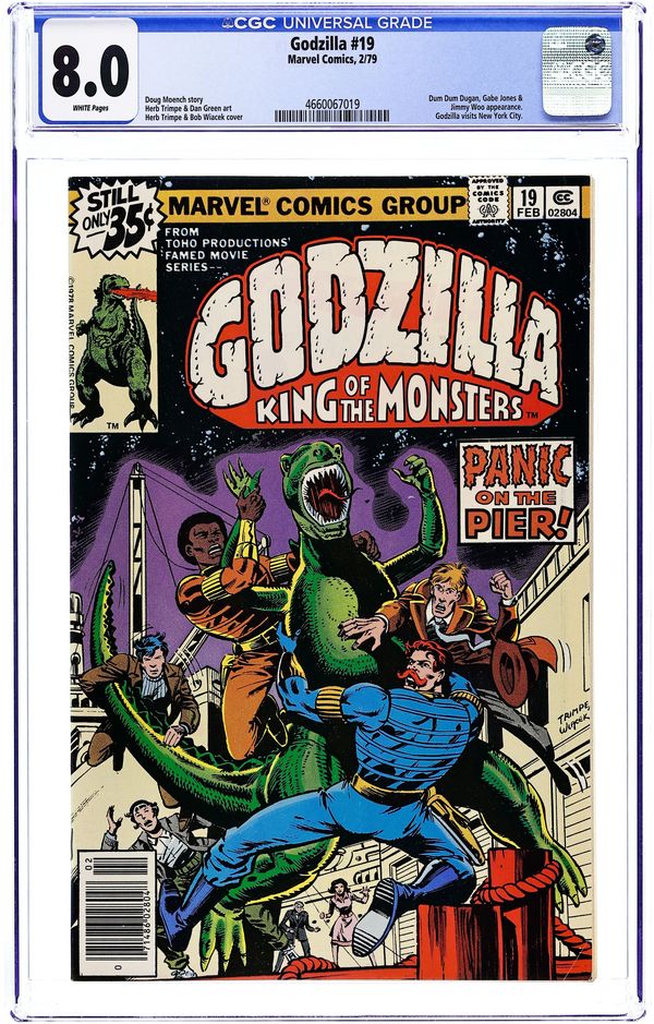 "With Dugan on the Docks!" Part 3 of 8. Story by Doug Moench. Art by Herb Trimpe and Dan Green. The Pym Particles that shrank the mighty Godzilla down to the size of a rat are slowly wearing off. Now, the once great leviathan is the size of a tall man, yet these tenacious humans continue to dog his every move. Cover price $0.35.