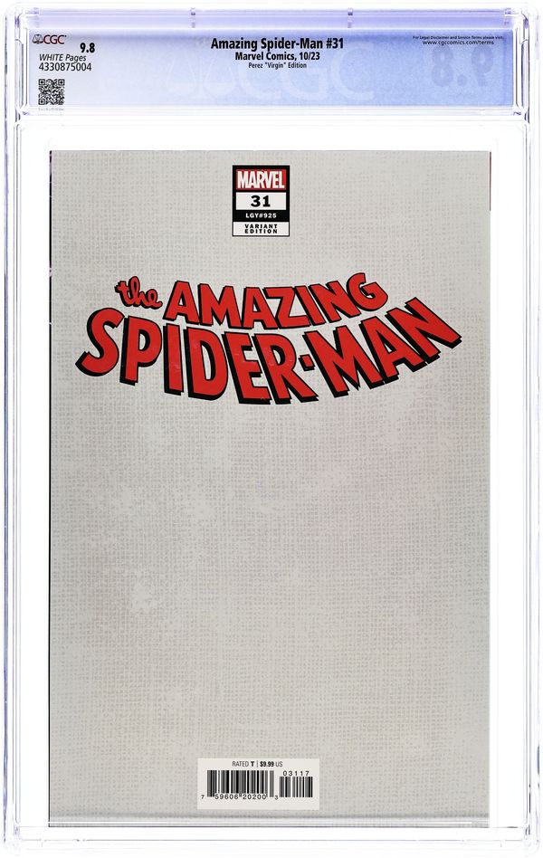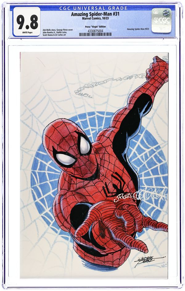 Limited 1 for 100 Retailer Incentive Variant Cover. Written by Zeb Wells. Art by John Romita Jr. Cover by George Perez. SPECIAL OVER-SIZED ISSUE! IT'S THE WEDDING OF THE YEAR! Peter Parker is the best man, and Tombstone is walking the bride down the aisle! That's right - Janice Lincoln and Randy Robertson are tying the knot, and there's NO WAY all the crime bosses in NYC aren't seeing this as an opportunity to off Tombstone. This story sets up our big Spider-Event of Zeb and Johnny's second year on ASM, and that's just the HALF of it! Also in this issue: bachelor/bachelorette parties, other ASM-story preludes, glimpses of some of the biggest unannounced Spider-projects and extra bonus awesomeness! 96 pages, full color. Rated T Cover price $9.99.