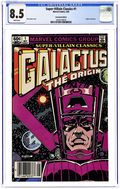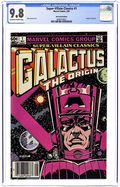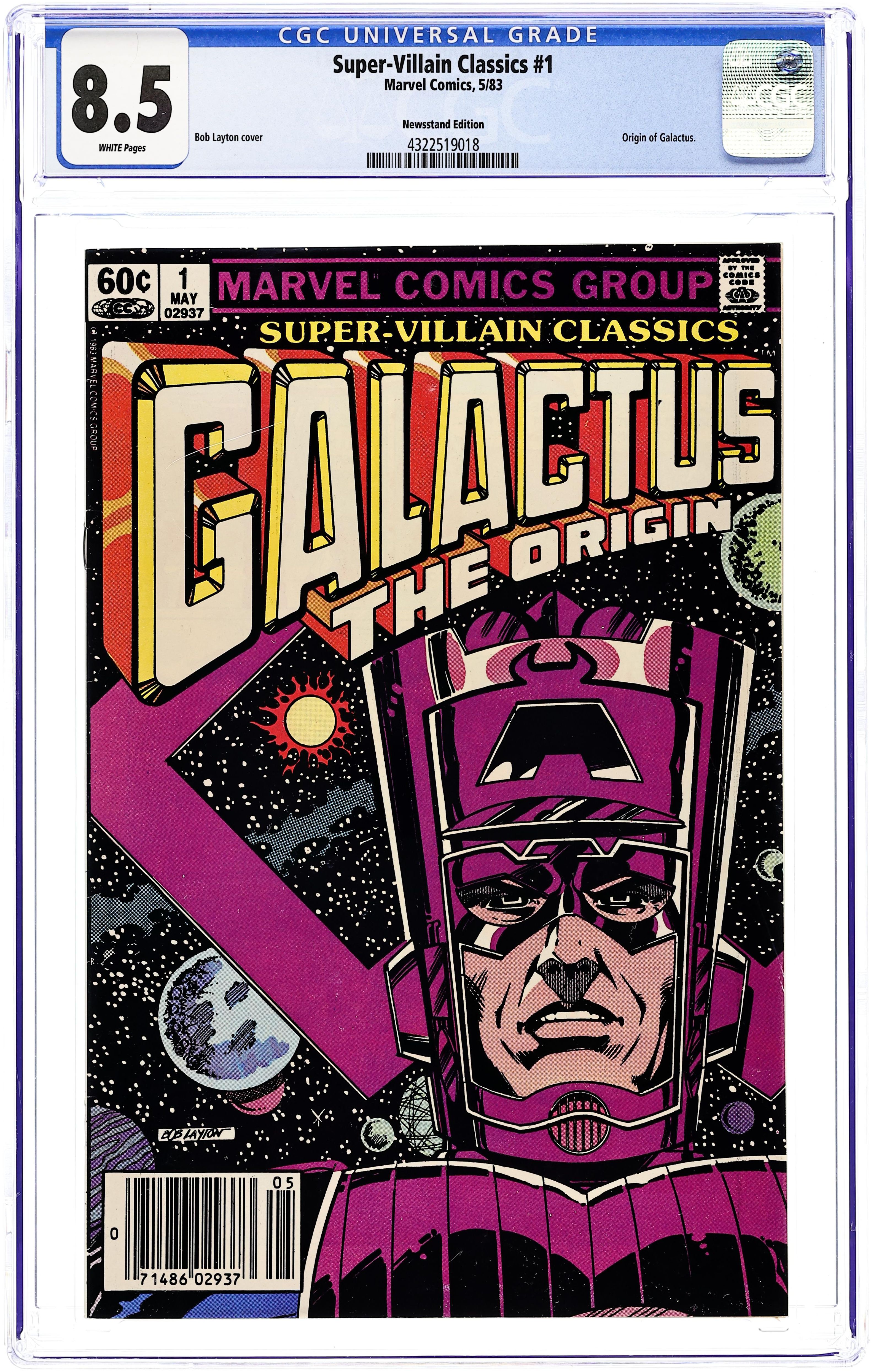 Newsstand Edition. Cover art by Bob Layton. "Galactus," script by Stan Lee and Mark Gruenwald, pencils by Jack Kirby and John Byrne, inks by Vince Colletta and George Klein; In a dying universe, on the planet of Taa, scientist Galan tries to find a way for his race to survive the end of the universe; He commandeers a spaceship towards the center of the imploding universe, but he does not die in "the big crunch"; Instead, he gestates in a cocoon for billions of years in a newly-formed universe; When he emerges, it is as Galactus, and he has to feed upon the life force of planets; Re-Telling of the Origin of Galactus; Original Story done by Lee, Kirby, Colletta and Klein with some panels modified or rearranged; New material done by the other artists. 36 pgs., full color. Cover price $0.60.