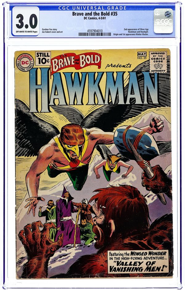 Cover by Joe Kubert. "Menace of the Matter Master!", script by Gardner Fox, art by Joe Kubert; A new costumed criminal named the Matter Master, who has a magic wand that allows him to control all matter, has been sighted around Midway City committing fantastic robberies; When the most recent involved the creation of giant meteor creatures who are robbing the city art center, Hawkman and Hawkgirl go into action to try and stop the theft; The Matter Master manages to get away with the stolen loot by using his powers to make helicopter propellers attack the winged duo; Later at his secret hideout, the Matter Master gloats over his recent victory are recalls how he gained his fantastic powers: How he was a scientist who accidentally discovered a new chemical, Mentachem, which he then fashioned into his magic wand to use for his own criminal gain. Dog Track - Wolf Track - Coyote Track article by Julius Schwartz, pencils by Morris Waldinger, inks by Tommy Nicolosi. "Valley of Vanishing Men," script by Gardner Fox, art by Joe Kubert; On an expedition to the Himalayas, Mavis Trent is captured by a band of abominable snowmen, which the Hawks learn are really descended from alien explorers. Eagle Dance article by Julius Schwartz, pencils by Morris Waldinger, inks by Tommy Nicolosi. Letters to the editor from comic writer Roy Thomas and writer Jerry Bails, plus a note from Kubert. 36 Pages, Full Color. Cover price $0.10.
