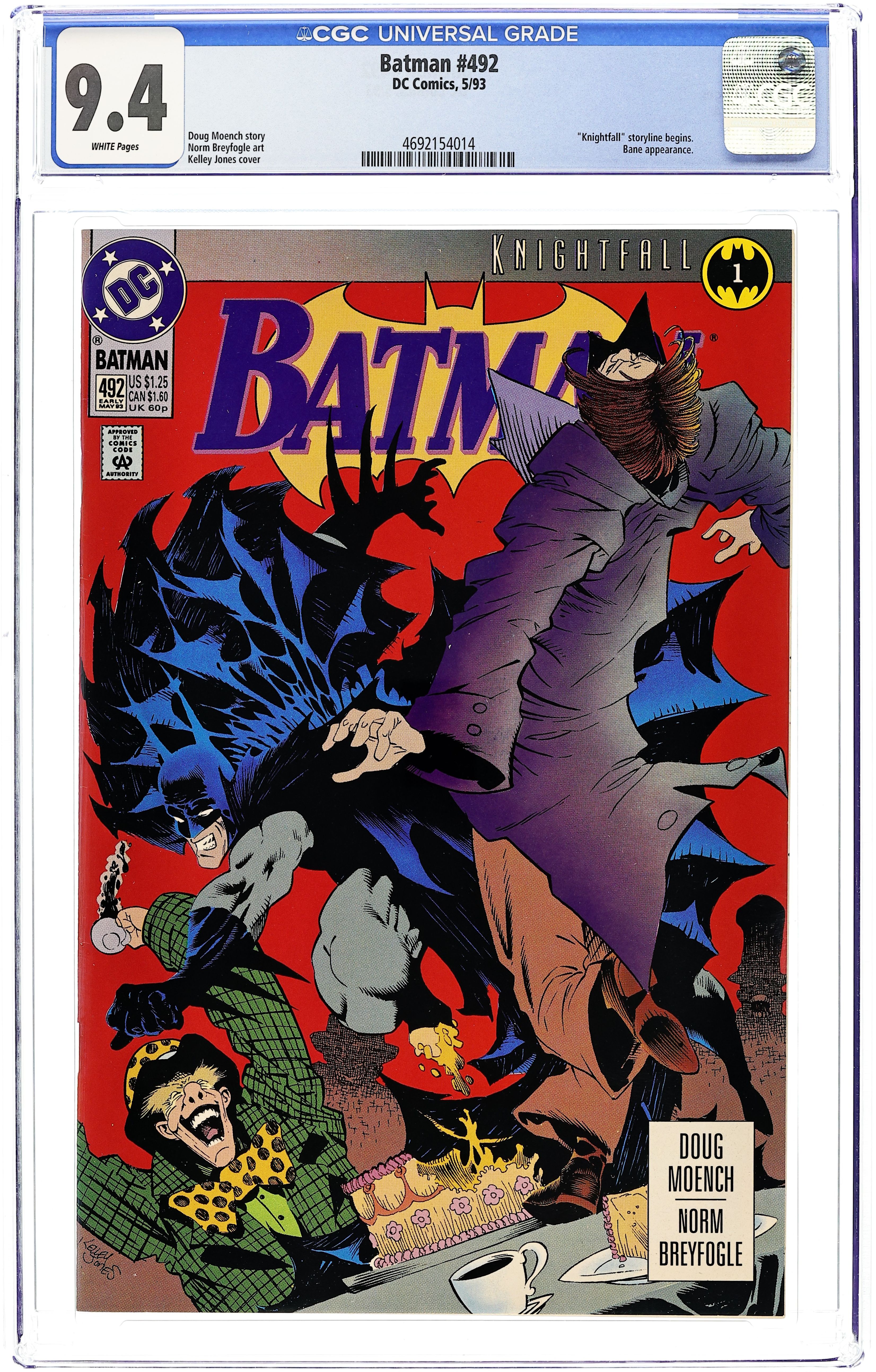 Direct Edition. KnightFall Part 1. The Mad Hatter invites Batman and Robin to a deadly tea party, while Bane contends with a nosy Film Freak in "Crossed Eyes and Dotty Teas." KnightFall continues in Detective Comics (1937- ) #659. Written by Doug Moench. Art by Norm Breyfogle. Cover by Kelley Jones. 36 Pages, Full Color. Cover price $1.25.