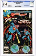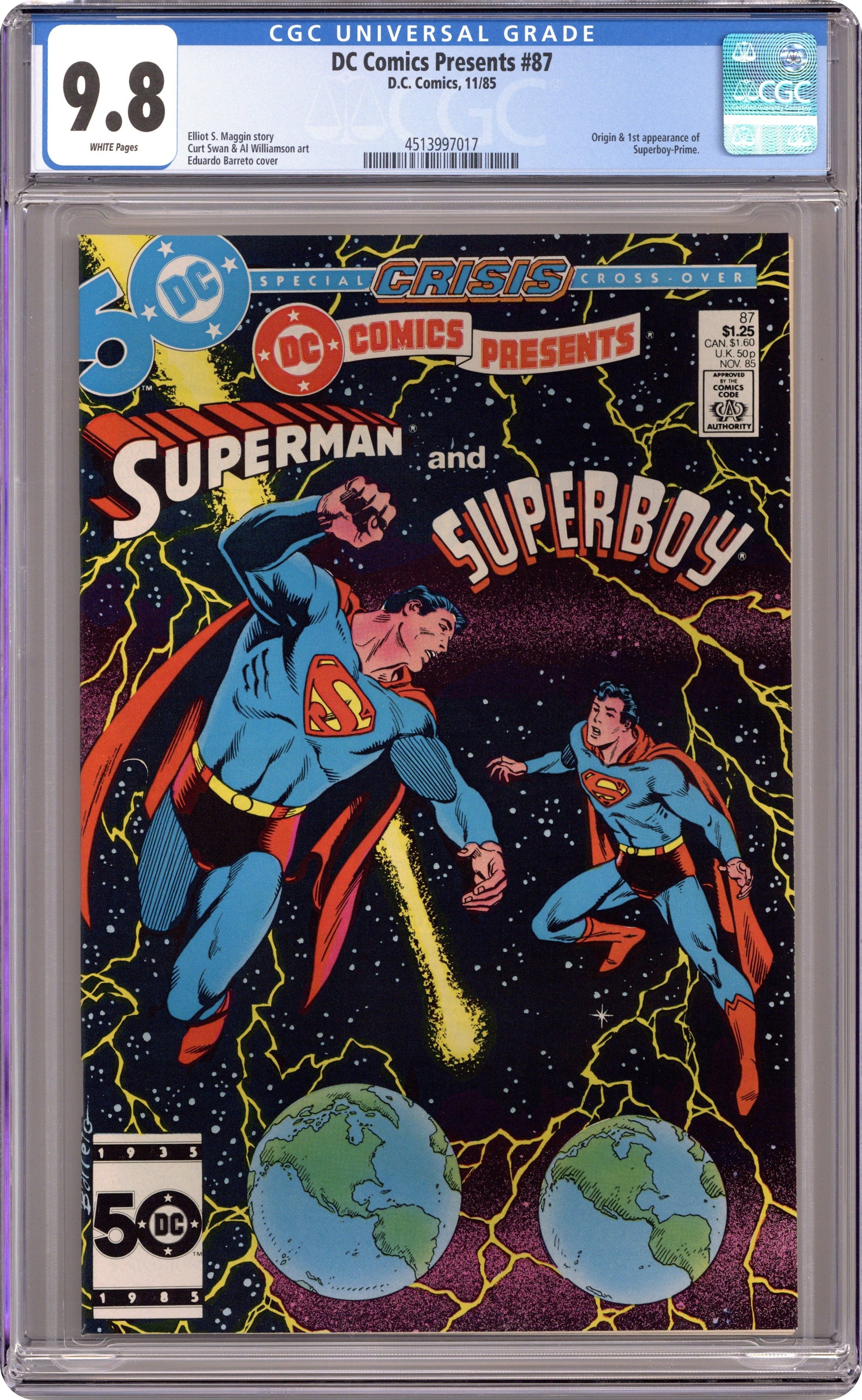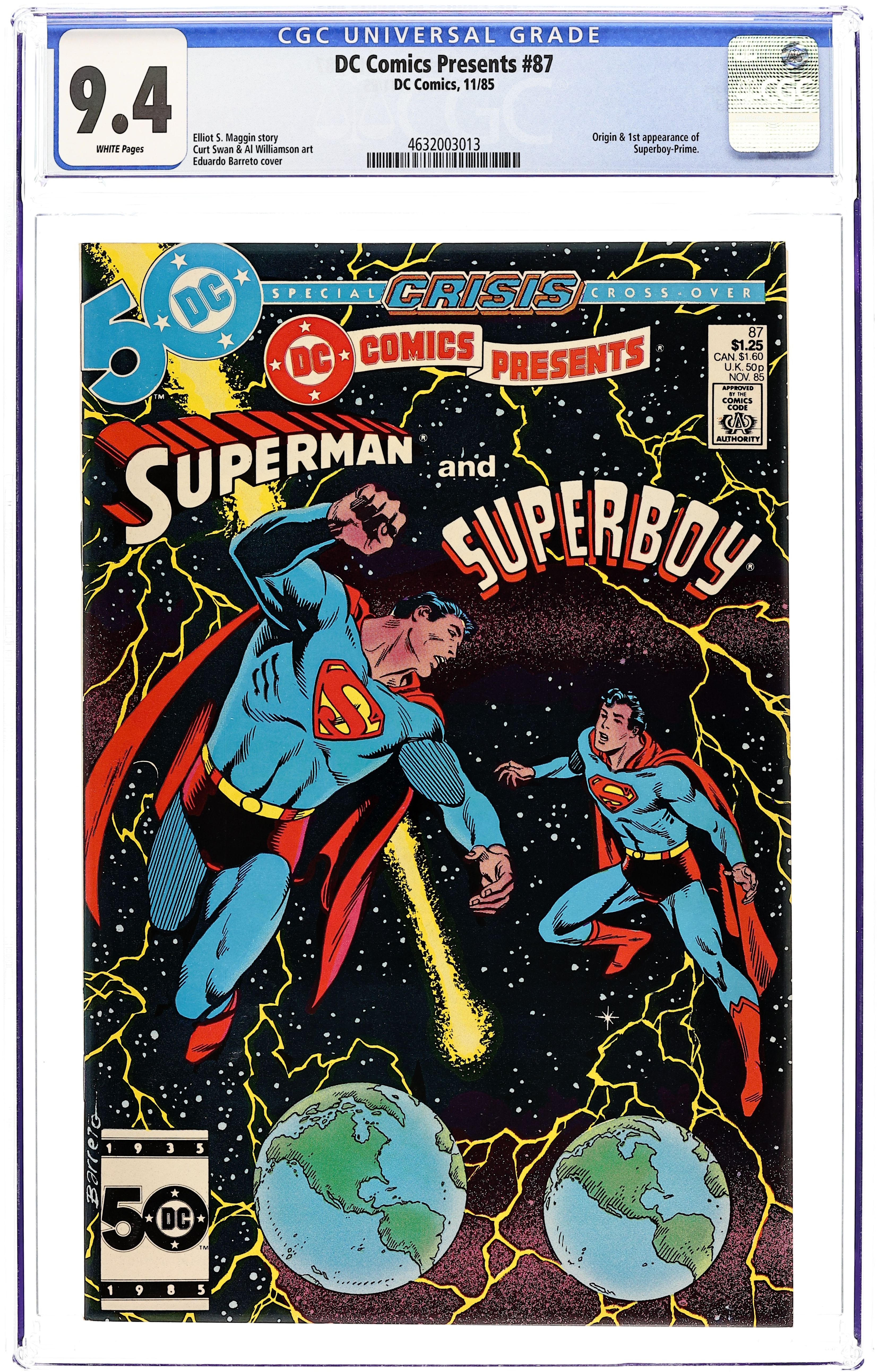 Direct Edition. Crisis on Infinite Earths cross-over. Zapped by an alien ray, Superman hops dimensions and teams up with Superboy-Prime to battle Polarians on Earth-Prime in the 24-page "Year of the Comet." Continued in Adventures of Superman (1939) #414. Script by Elliot S! Maggin, art by Curt Swan & Al Williamson. Plus: the 16-page "Origin of Superboy-Prime" by Maggin, Swan & Williamson. Cover by Eduardo Barreto. Cover price $1.25.