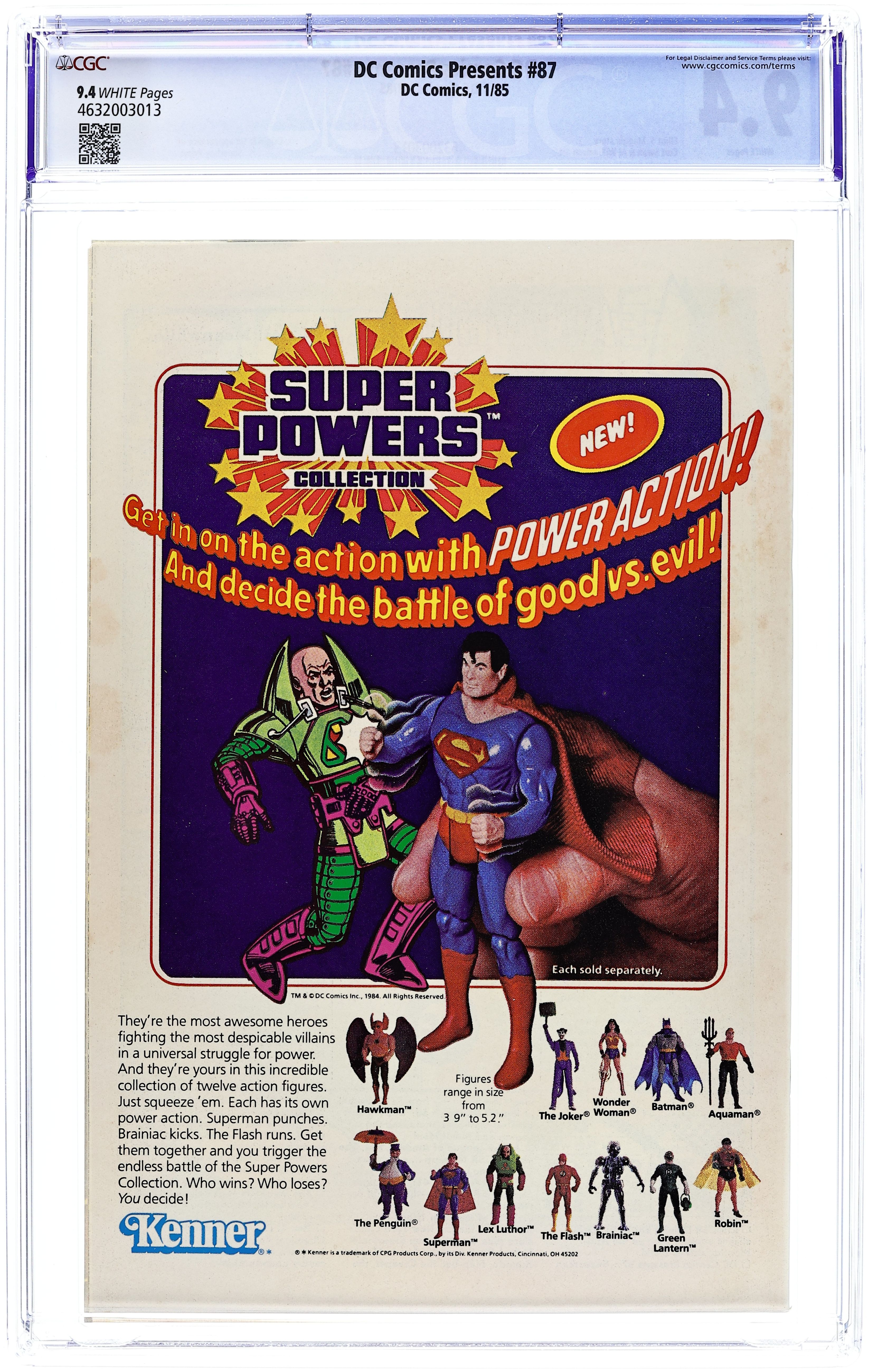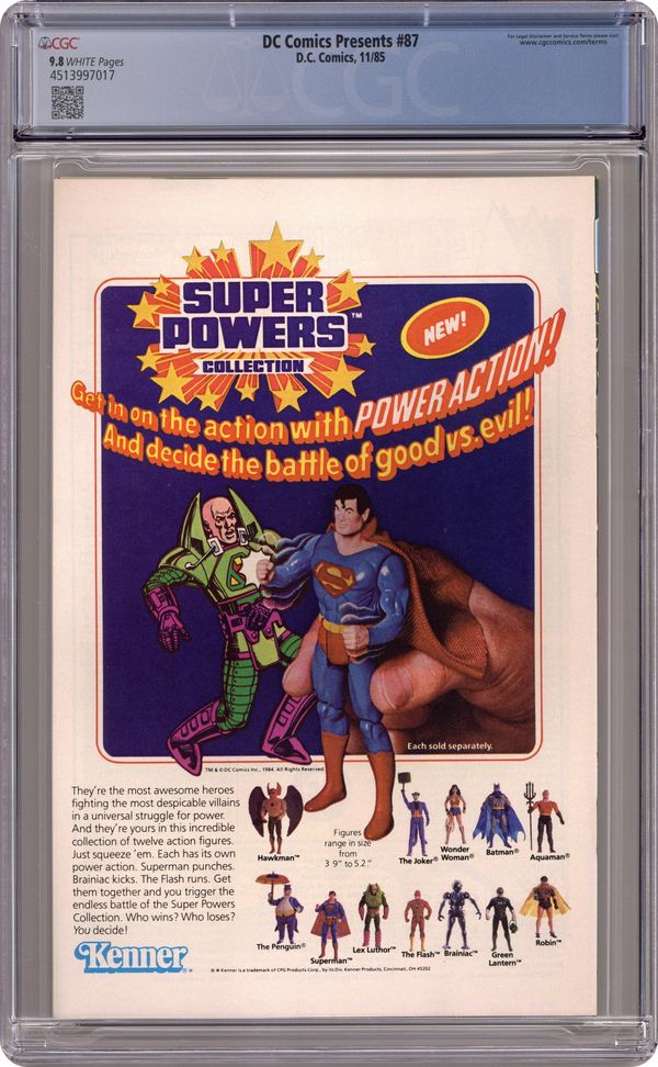 Direct Edition. Crisis on Infinite Earths cross-over. Superman must survive against his age-old enemies of the Superman Revenge Squad, whose sole creed is "Revenge is Life - - Death to Superman!" Continued from DC Comics Presents (1978 DC) #87. Superboy-Prime cameo. Script by Elliot S! Maggin, art by Curt Swan & Al Williamson. Cover by Eduardo Barreto. 36 Pages, Full Color. Cover price $0.75.