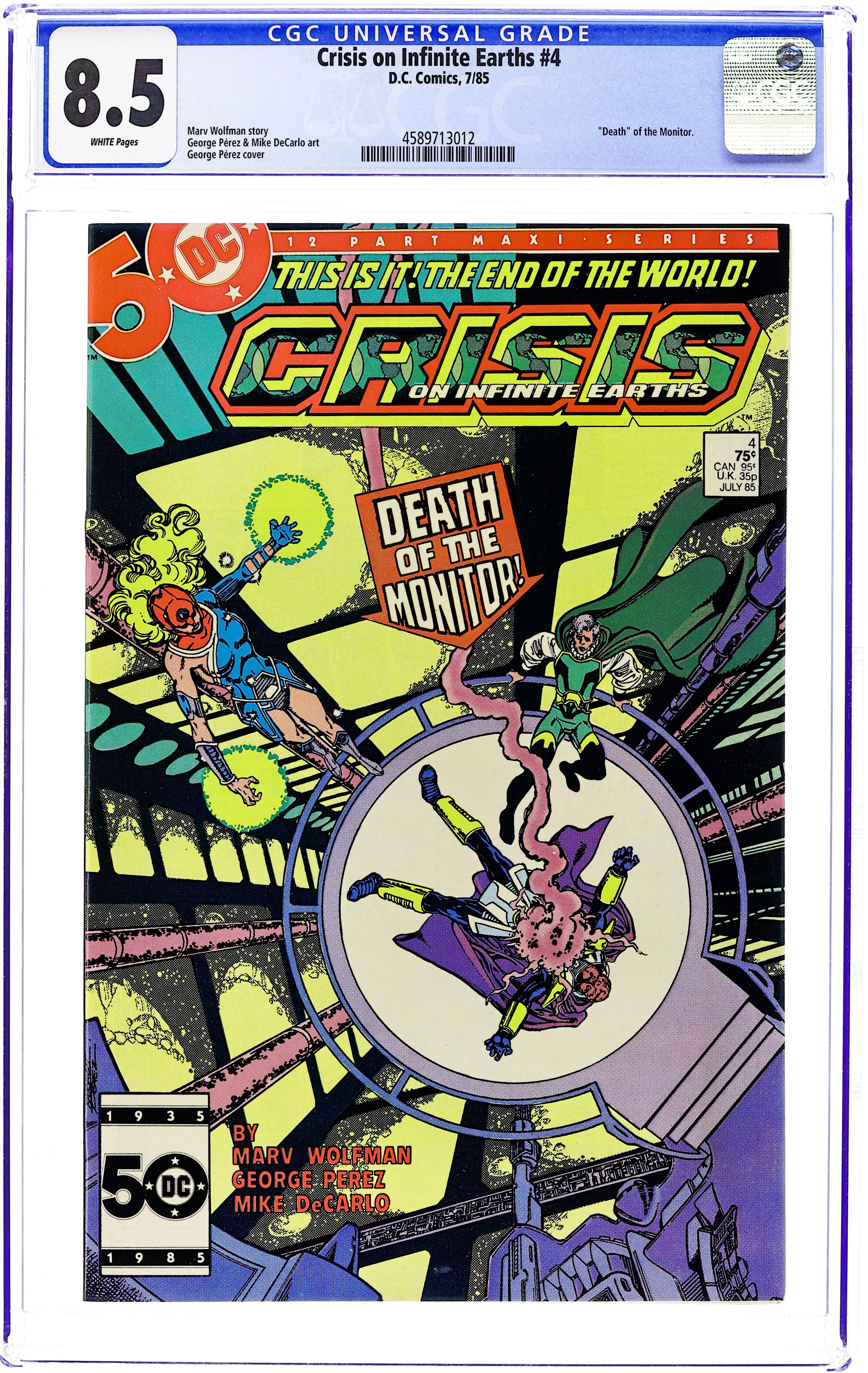Ends Dec 8 7:57 PM CST Bid History 10 bids Current Bid $66 Your Secret Max Bid If you'd like to bid, please log in or register. Direct Edition. "Beyond the Silent Night!" Written by Marv Wolfman. Art by George Perez, Dick Giordano, and Jerry Ordway. At last the origins of the most mysterious players in this story are revealed. Learn the secret pasts of Pariah, and why he is destined to witness world after world die, the tragic past of Harbinger, the mysterious Monitor, and evil incarnate, the Anti-Monitor. Plus, in order to stop the Anti-Monitor from destroying the last remaining Earths in the multiverse, a cadre of the DCU's most powerful heroes mount an all out assault on the villain's stronghold in the dangerous Anti-Matter Universe. It is a task not everyone will survive. Featuring the heroic and tragic death of Supergirl. Cover price $1.25.