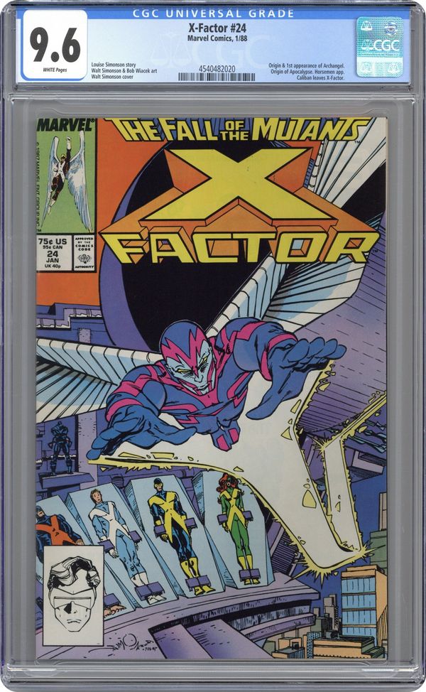 Direct Edition. Fall of the Mutants! Part 1 of 3. "Masks!" 1st full appearance of Archangel. Story by Louise Simonson. Art by Walter Simonson and Bob Wiacek. One of the biggest mutant events to ever hit the comic racks begins here. The powerful mutant known as Apocalypse finally makes his move and unleashes his Four Horseman on an unsuspecting world. The only thing standing between humanity and total annihilation is X-Factor. However when the fourth and final Horseman, Death, reveals his true identity, the group will be rocked to its very core. This is a pivotal chapter in the lives of the original X-Men. Cover price $0.75.