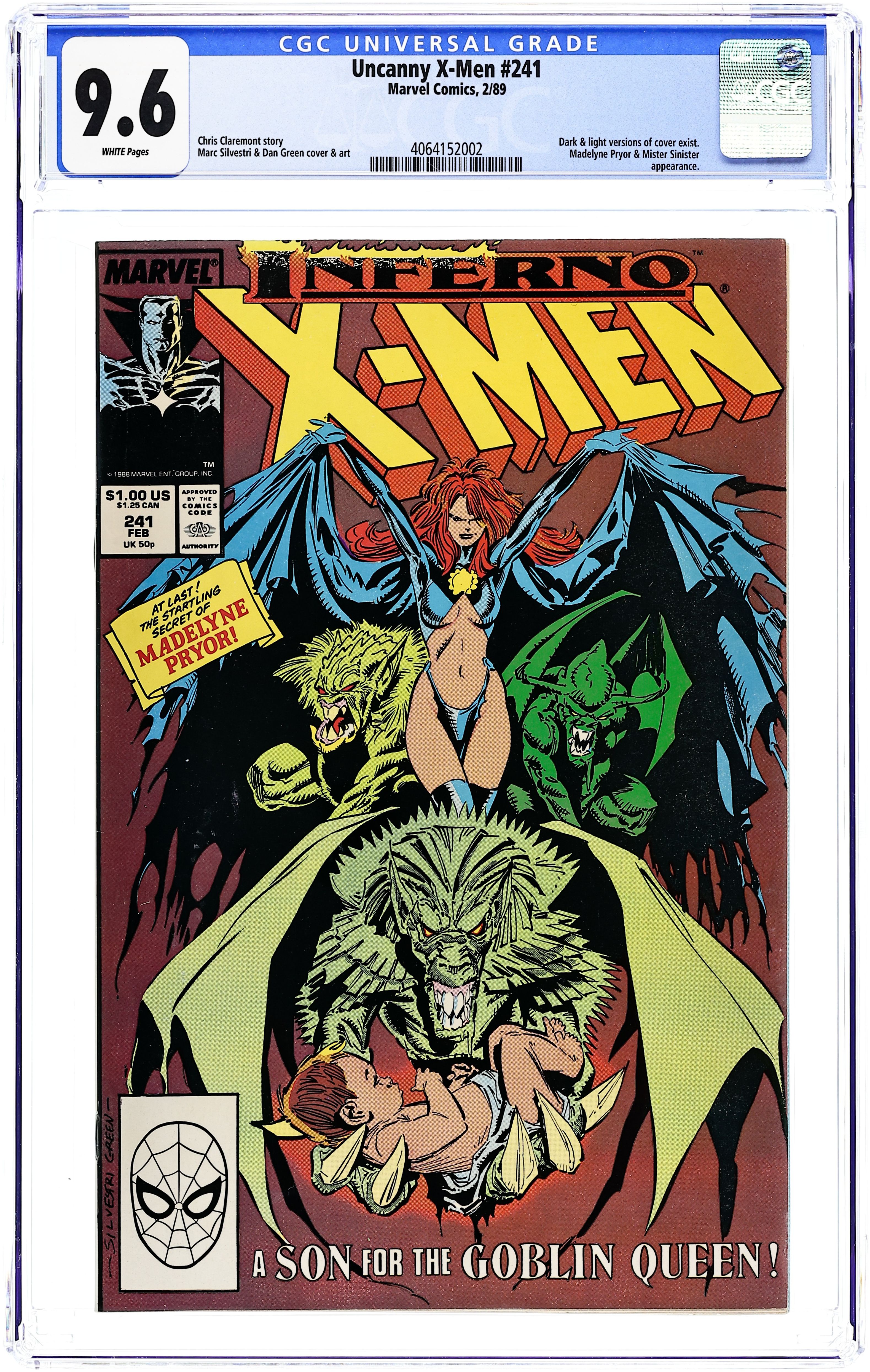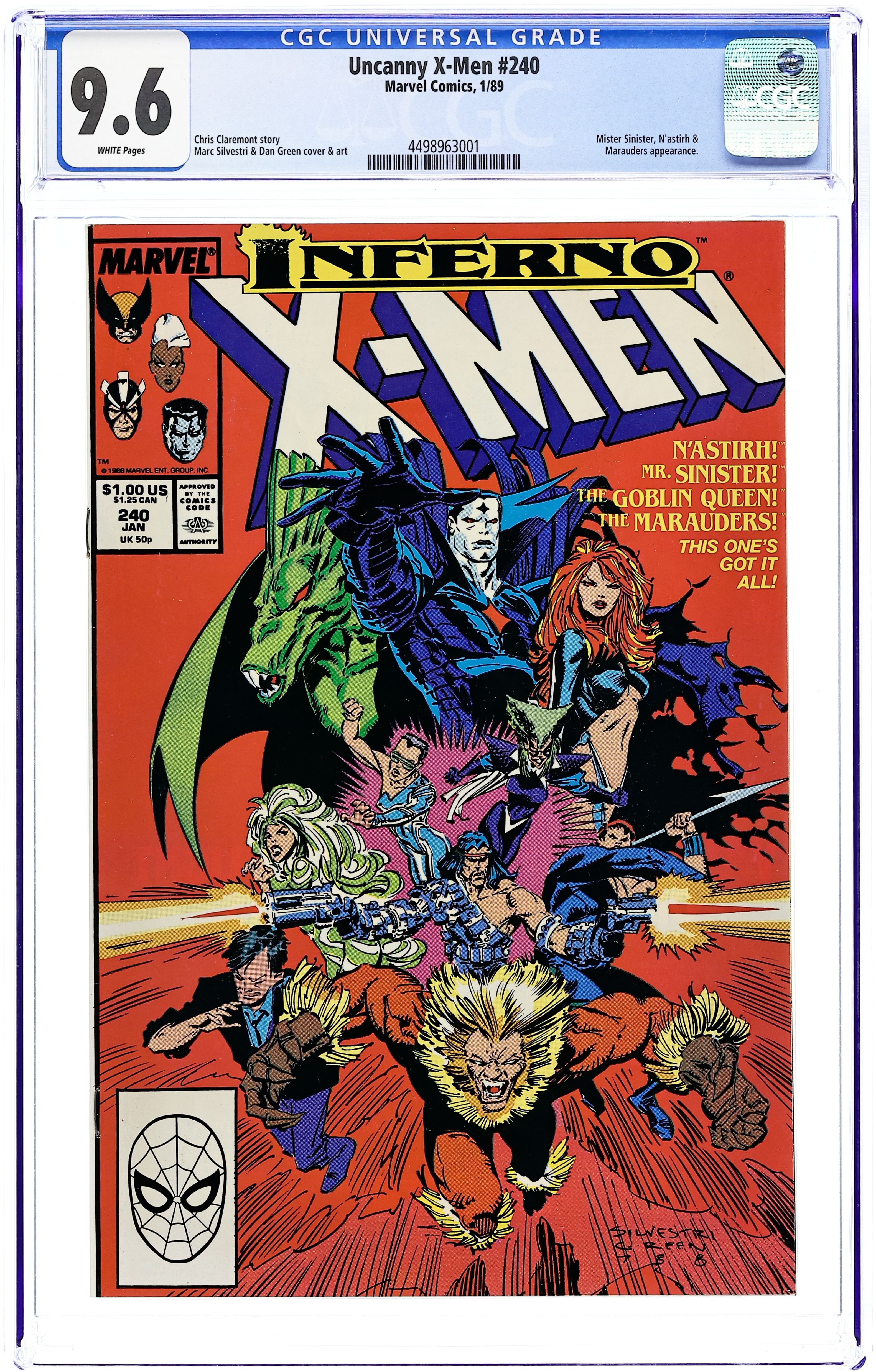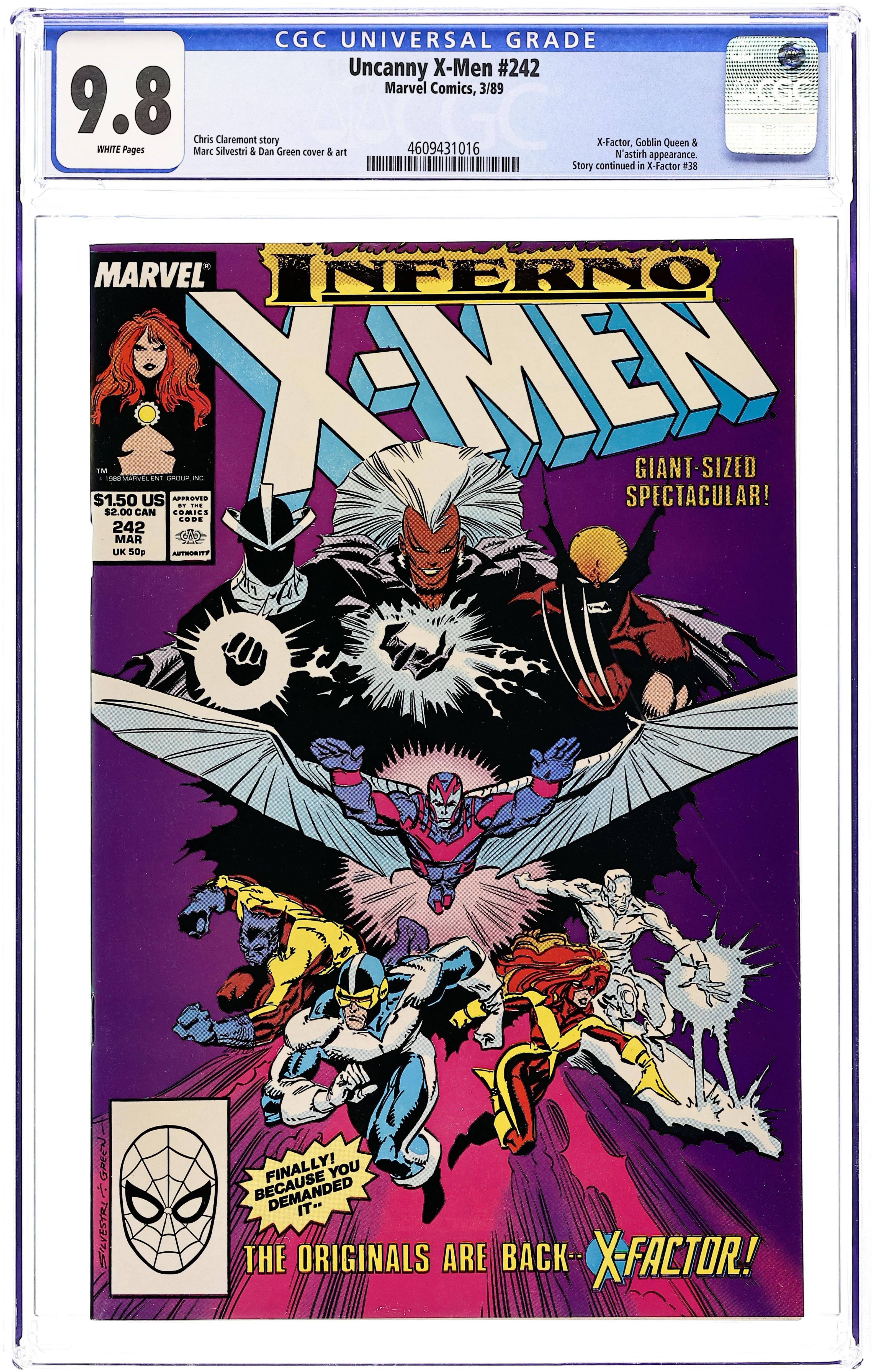 Giant-Sized Spectacular - Inferno: Part 4 of 7 - "Burn!" Guest-starring X-Factor. Story by Chris Claremont. Art and cover by Marc Silvestri and Dan Green. Story continued from X-Factor (Vol. 1) #37. It had to happen...the original X-Men - Cyclops, Ice Man, Archangel, Beast, and Jean Grey - are back! But with the demonic spell cast over New York City will X-Man be forced to fight X-Man. Plus, more startling revelations about Scott and Madelyne's baby, and more twists and turns in the storyline that has consumed the Marvel Universe - Inferno! Story continued in X-Factor (Vol. 1) #38. NOTE: The Inferno also runs through New Mutants #71-73. 52 pgs. Cover price $1.50.