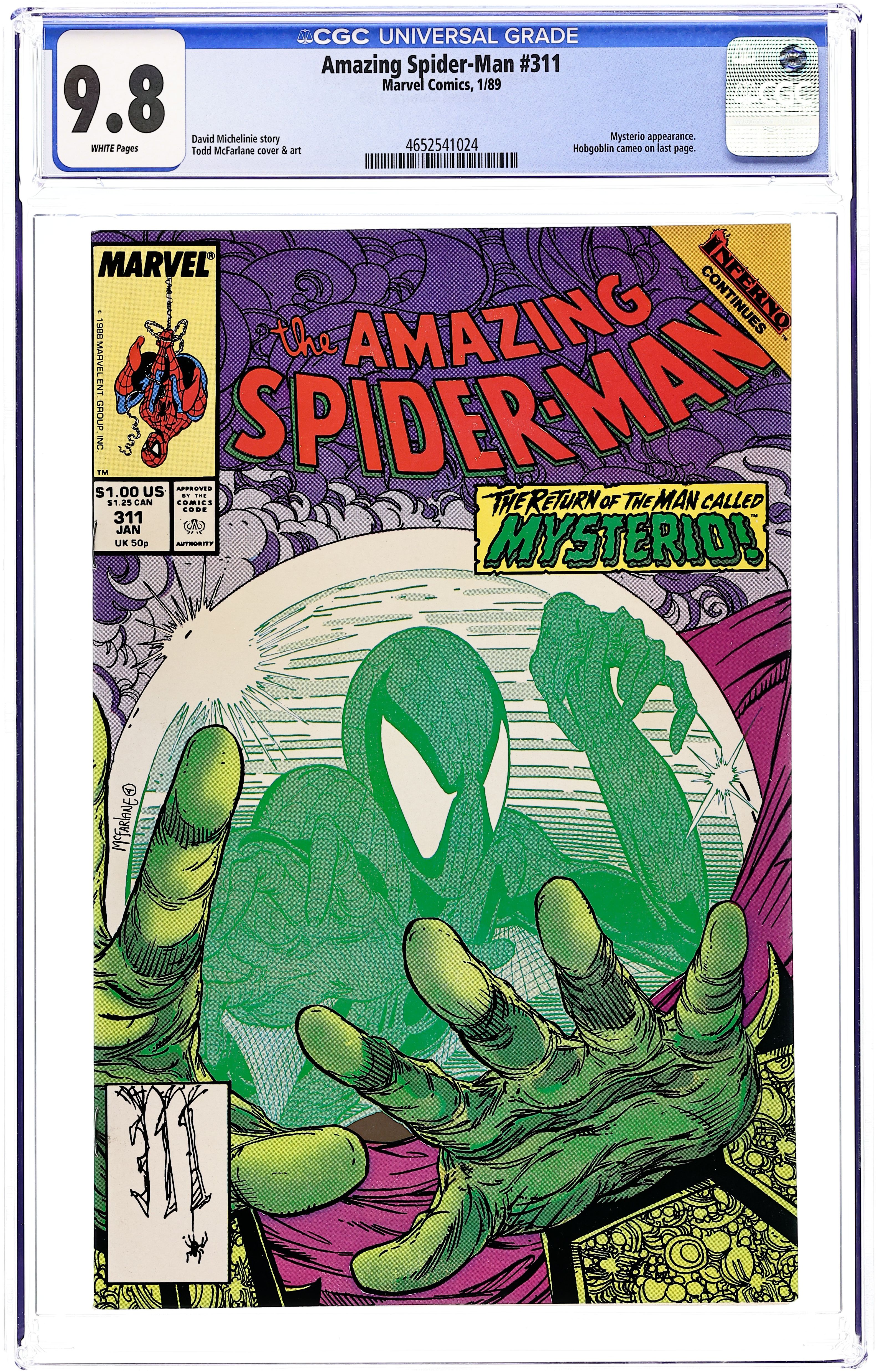 Direct Edition. "Mysteries of the Dead" Inferno crossover. Script by David Michelinie. Art by Todd McFarlane. Cover by Todd McFarlane. Crazy things are happening in the Big Apple as a result of Inferno! When a brick building comes to life and crushes an innocent bystander, the wondrous wall-crawler is devastated that he couldn't save the poor man. However, the next day when he returns to the same location, the web-slinger senses a mystery. Or perhaps better stated...Mysterio! Under the cover of Inferno, the Master of Illusion attempts to wreak havoc on Spider-Man's life! Can the spectacular one see through the mist and fog and solve (the) Mysterio? Appearance by Mary Jane Watson. Cameo appearances by Dr. Curt Connors, Harry Osborn, Liz Osborn, Normie Osborn, and the Hobgoblin. (Notes: Elements of the story continue in Spectacular Spider-Man 146.) 36 pgs. Cover price $1.00.