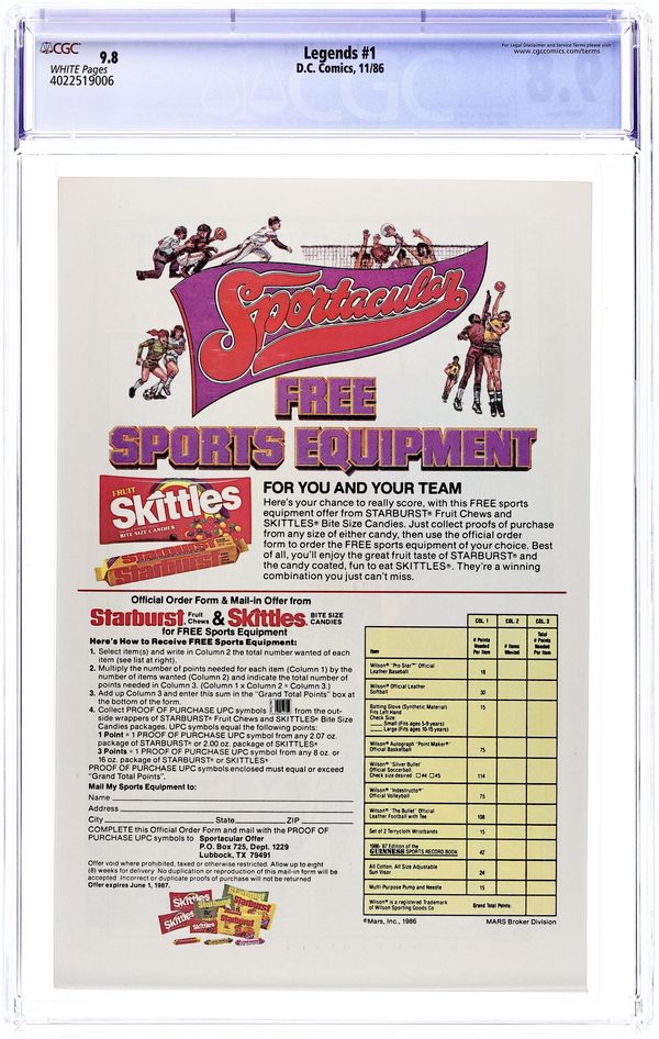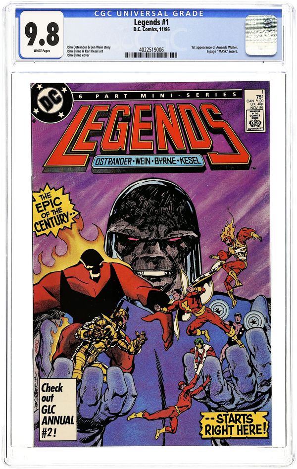 Direct Edition. Includes Mask comic insert. Darkseid once again reigns supreme on Apokolips, but the legendary super-heroes of Earth remain a thorn in his side. Thus, he begins Operation Humiliation. Firestorm battles Brimstone, Flash takes on Deadshot, and Captain Marvel (in his first post-Crisis appearance) fights Macro-Man. Legends is designed to kick off three new ongoing series (The Flash, Suicide Squad, and The Justice League) and a mini series (Shazam: A New Beginning). Plotted by John Ostrander and scripted by Lein Wein, with pencils by John Byrne and inks by Karl Kesel. Cover price $0.75.
