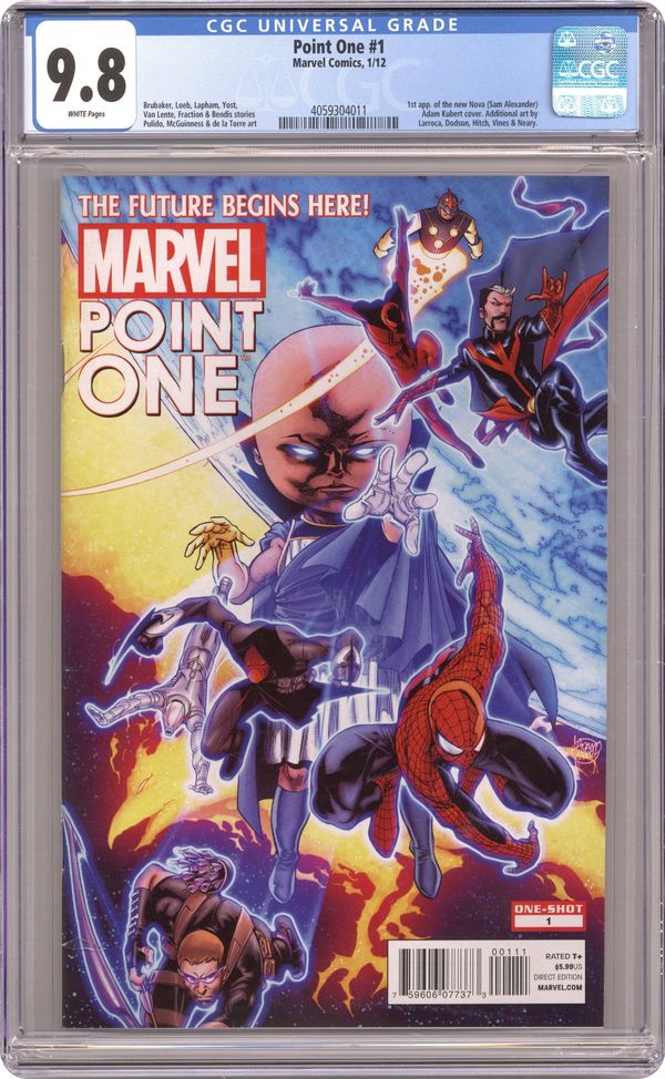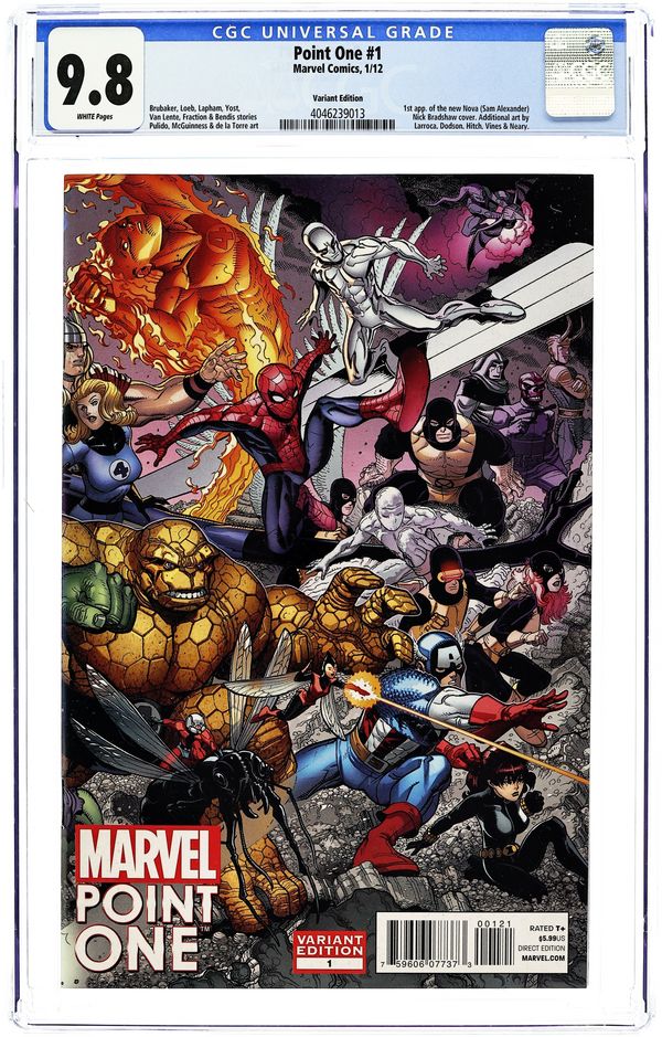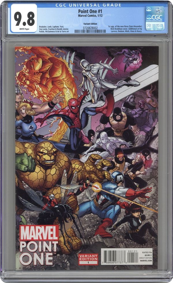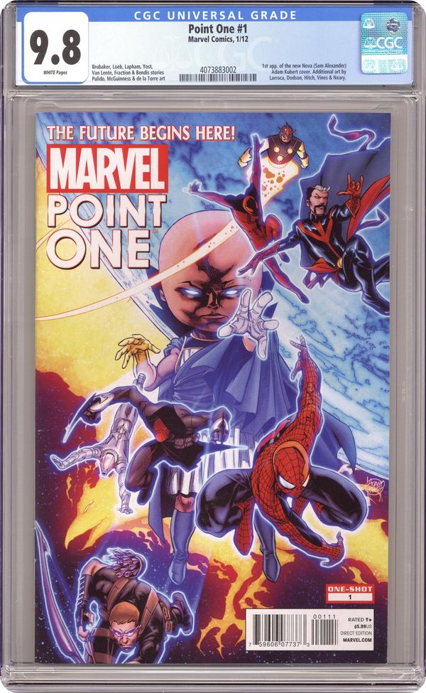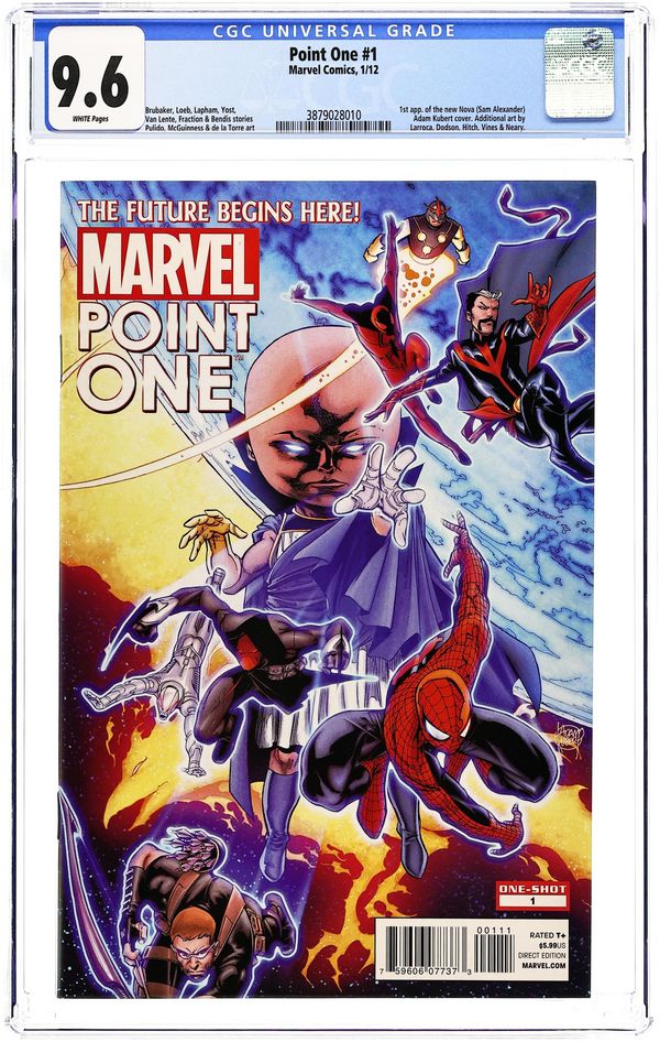 1st appearance of Nova (Sam Alexander) - Written and Drawn by BRIAN MICHAEL BENDIS, JEPH LOEB, ED BRUBAKER, MATT FRACTION, DAVID LAPHAM, FRED VAN LENTE, CHRISTOPHER YOST, ED mCGUINNESS, BRYAN HITCH, TERRY DODSON, ROBERTO DE LA TORRE, RYAN STEGMAN, JAVIER PULIDO, and MORE! IT ALL BEGINS HERE! Here are SEVEN all-new stories that set the stage for everything coming your way in 2012 from the biggest names in the comics industry. You CANNOT miss this! Catch a tease of the biggest change to the Marvel Universe in over 35 years! 64 PGS./Rated T+ ...$5.99 Cover price $2.99.