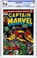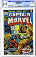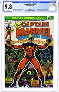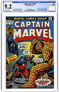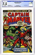 The Super-Skrull continues to pester Captain Marvel in "Trapped on Titan!" Script by Mike Friedrich, plot and pencils by Jim Starlin, inks by Pablo Marcos. Meanwhile, Thanos seeks out the Cosmic Cube. Cameos by the Thing (of the Fantastic Four), the Avengers (Captain America, Iron Man, the Scarlet Witch, the Vision, and the Black Panther), and Drax the Destroyer. This issue also contains a map of Titan. Cover price $0.20.