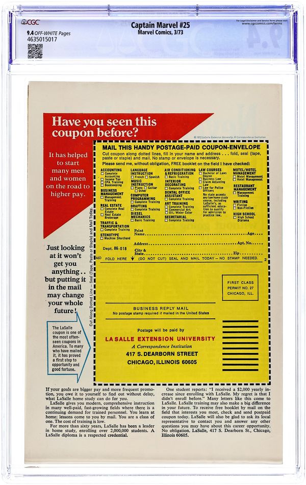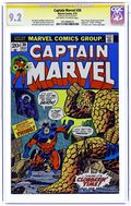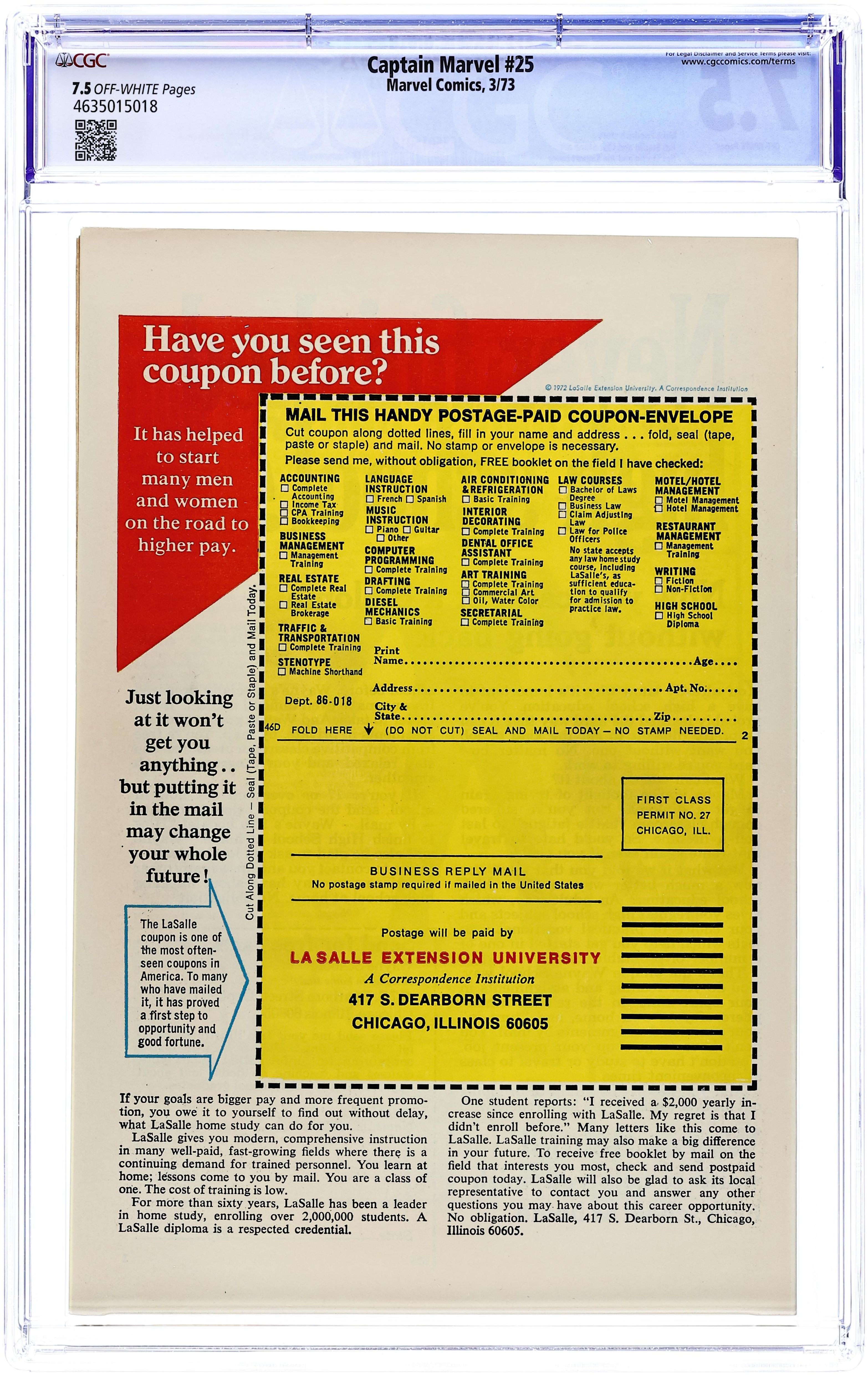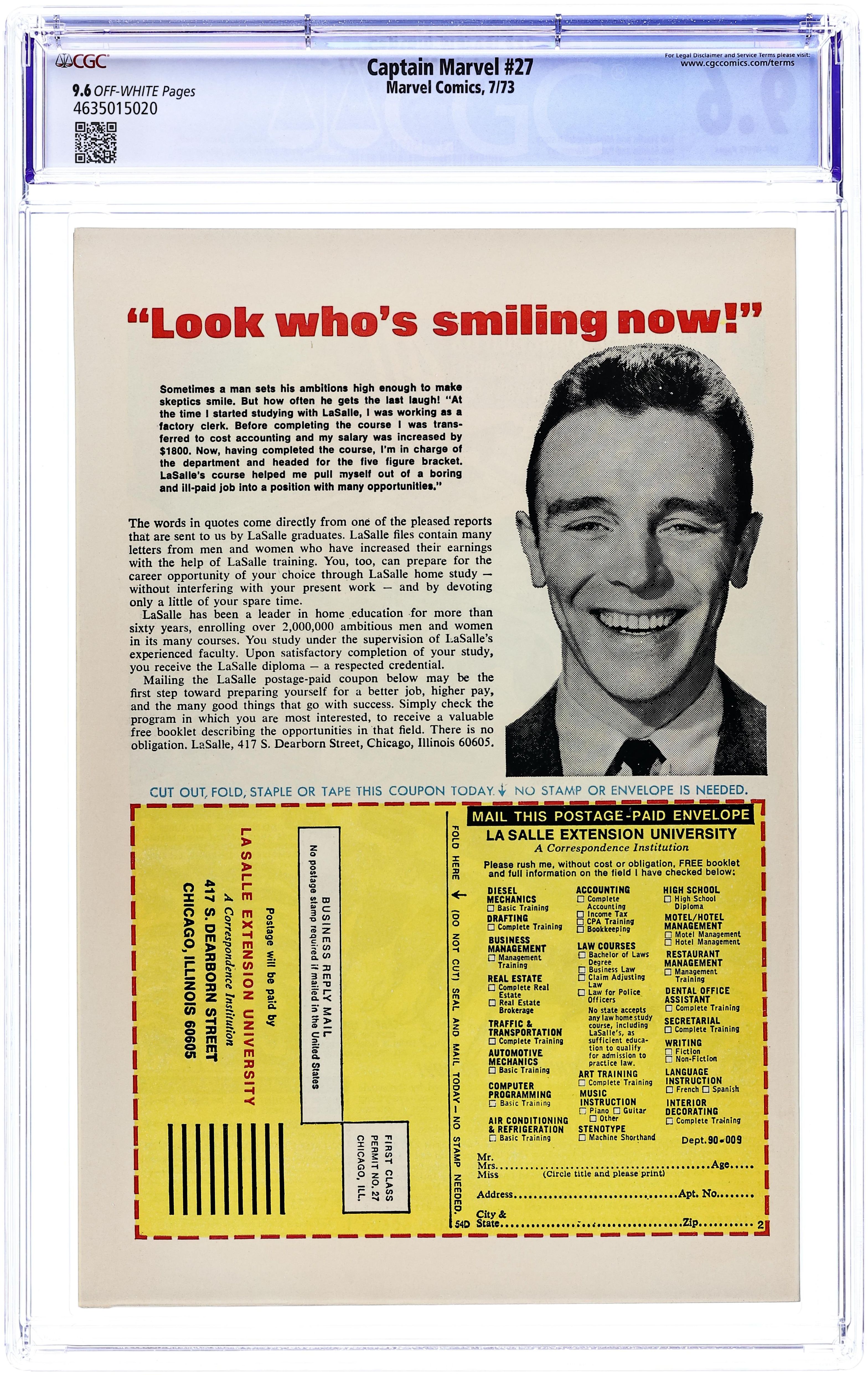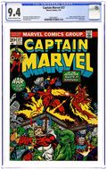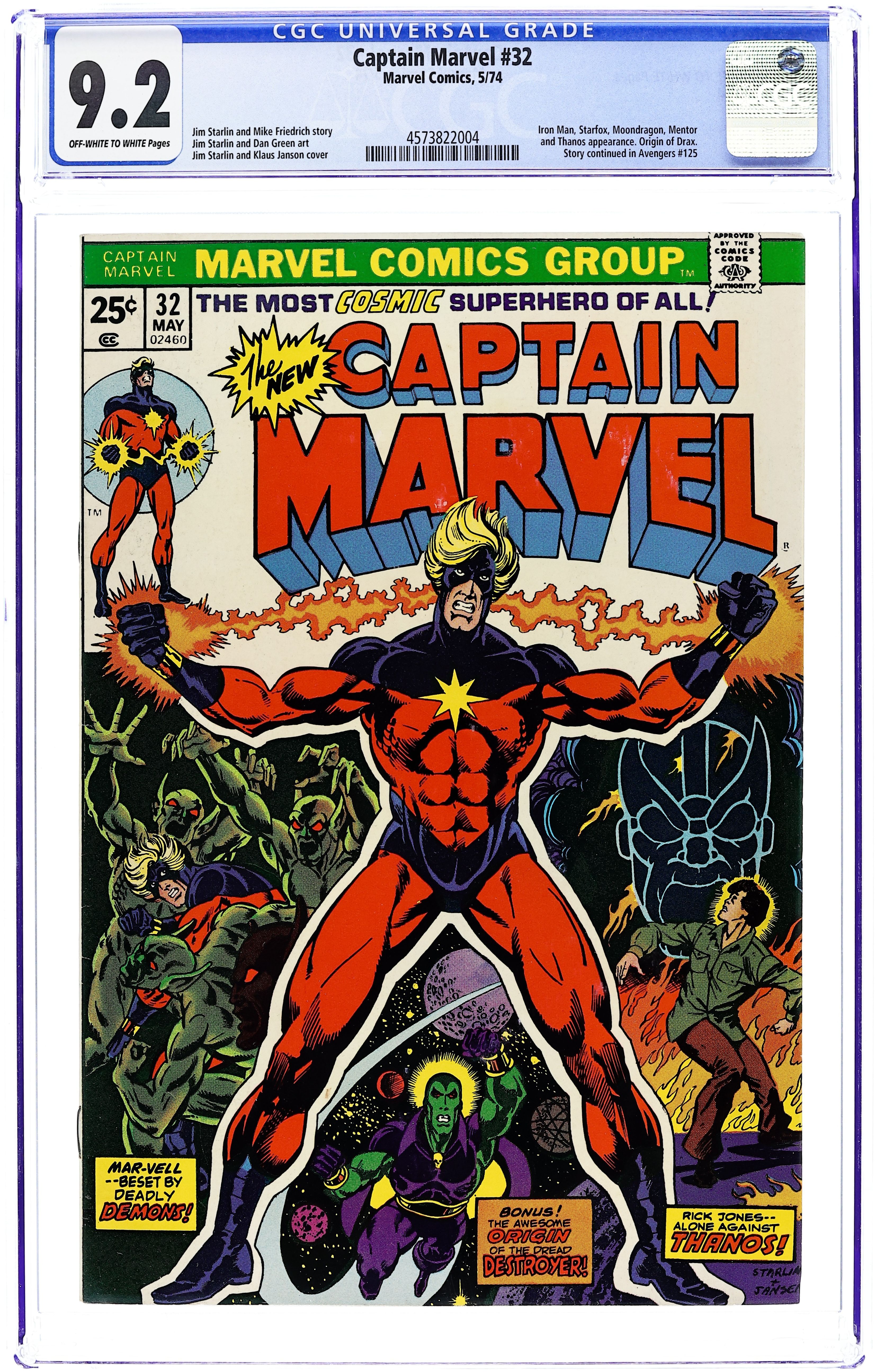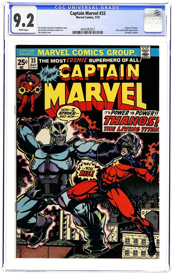 Captain Marvel battles Thanos in "The God Himself!" Script by Steve Englehart, plot and pencils by Jim Starlin, inks by Klaus Janson. Guest starring Drax the Destroyer. Brief appearance by the Avengers (Thor, Iron Man, the Vision, the Swordsman, Captain America, the Black Panther, and the Scarlet Witch). The letters page contains Marvel Value Stamp series A # 6 (Thor by John Buscema). Starlin cover. Cover price $0.25.