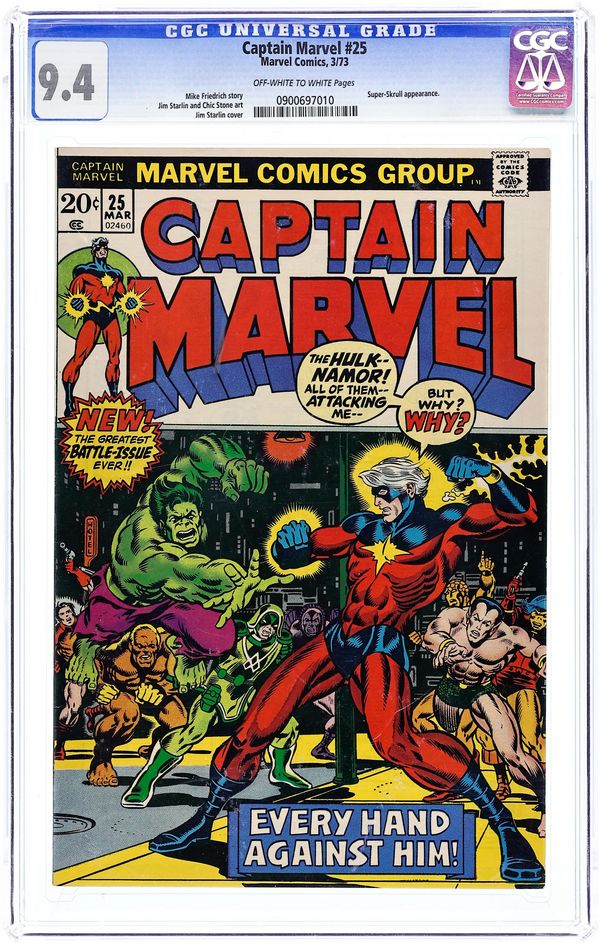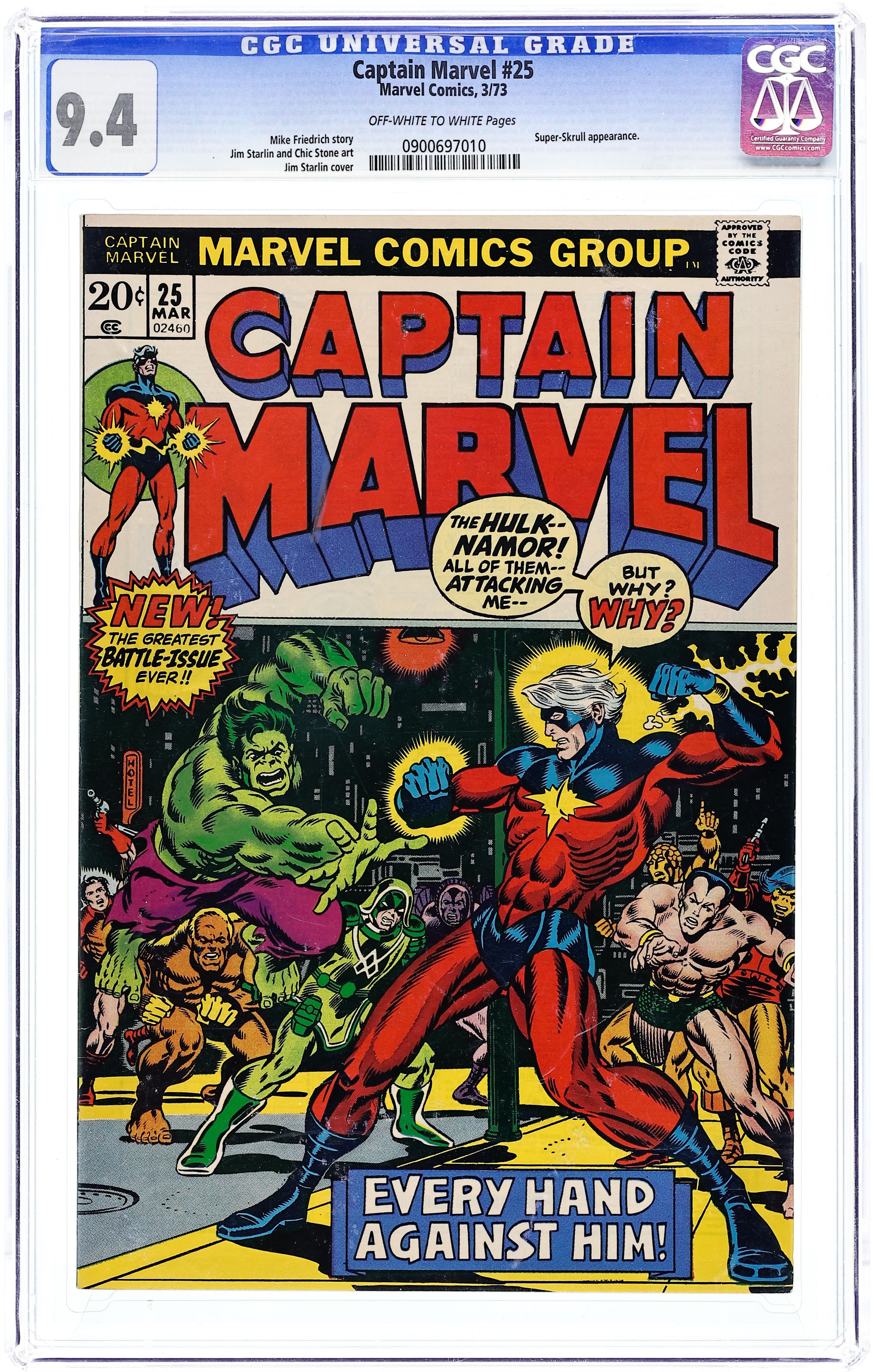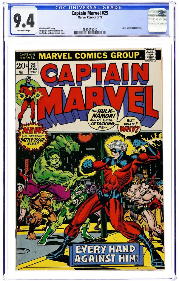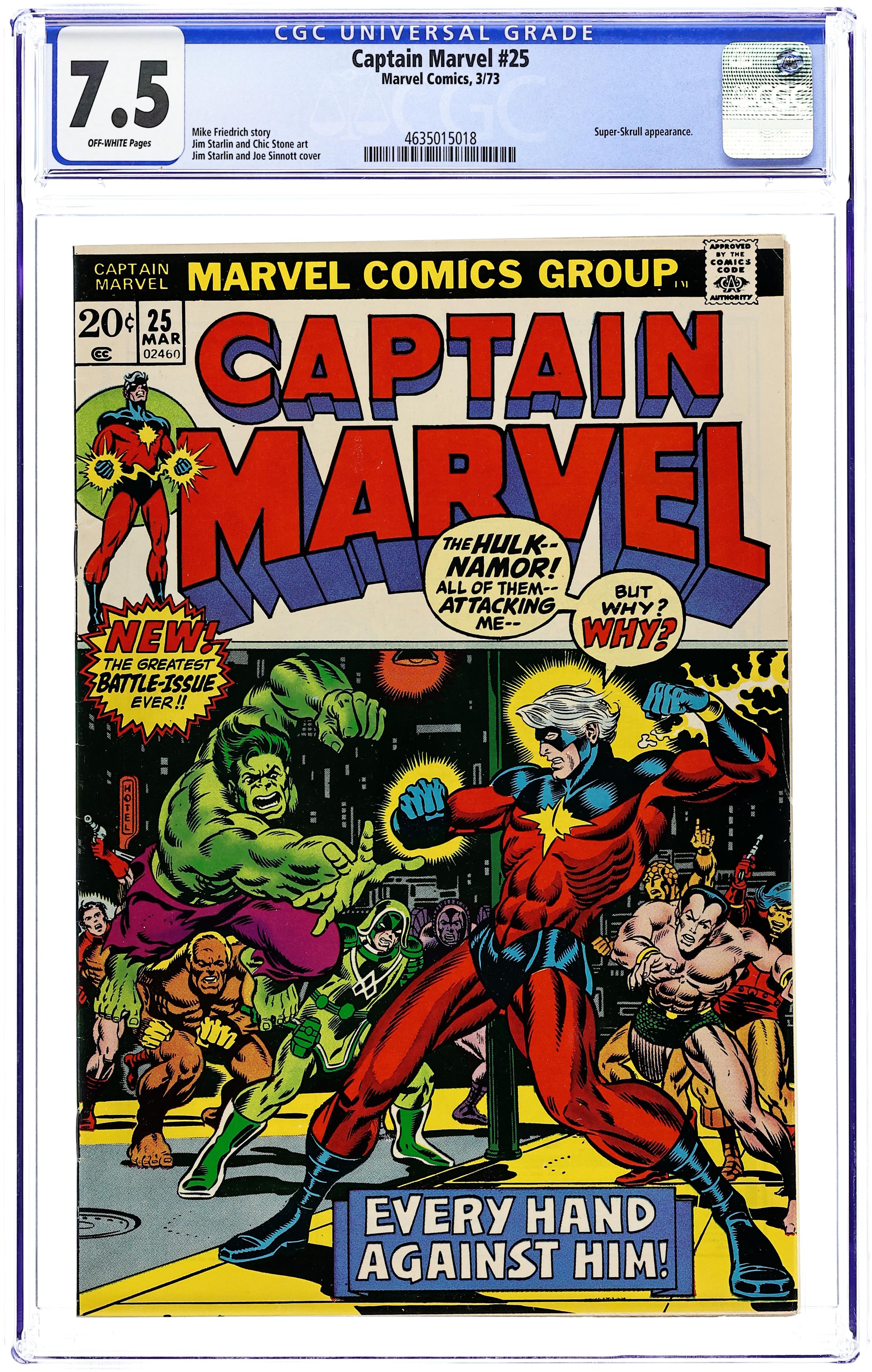 Cover pencils by Jim Starlin, inks by Joe Sinnott. Captain Marvel battles the Super-Skrull (in the guise of Ronan, Megaton, Yon-Rogg, the Hulk, and the Sub-Mariner) in "A Taste of Madness!", script by Mike Friedrich, pencils by Jim Starlin (first work on the series), inks by Chic Stone; In an elaborate scheme of the Skrulls and their mysterious Masterlord, Super-Skrull and Kl'rt, Rick Jones is framed for the murder of Dr. Benjamin Savannah and brought to a run-down police precinct; Using Super-Skrulls invisibility as well as other Skrull technology, Mar-Vell and Rick are led to believe that many of his long-time friends and foes have returned and are attacking him; Rick and Mar-Vell identify the ruse, and Mar-Vell attacks the Skrulls; The building collapses in the battle and the Skrulls escape. 36 pgs., full color. Cover price $0.20.