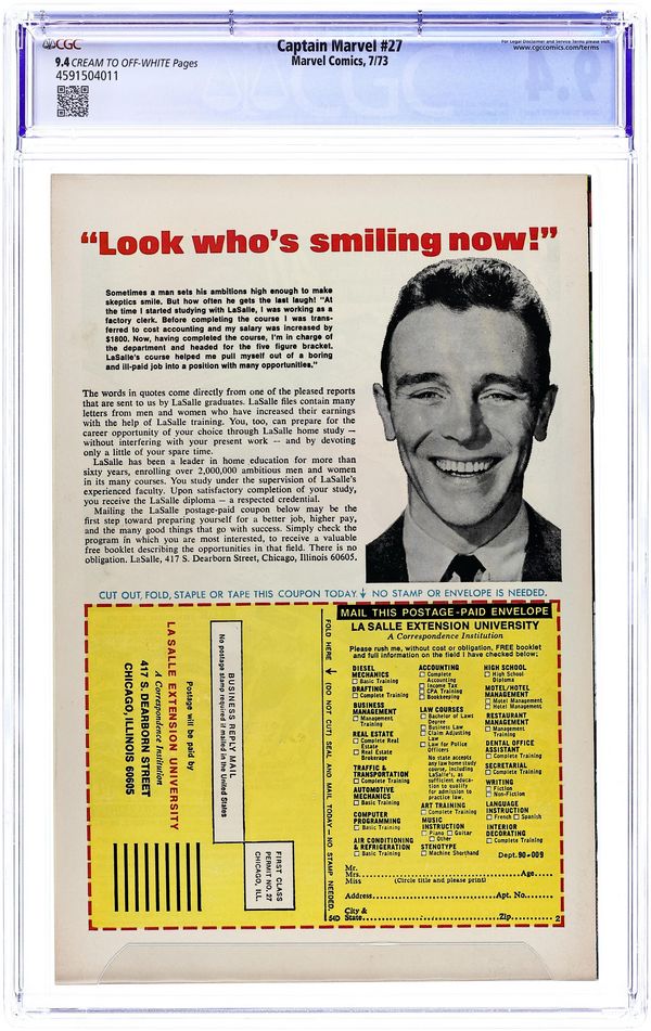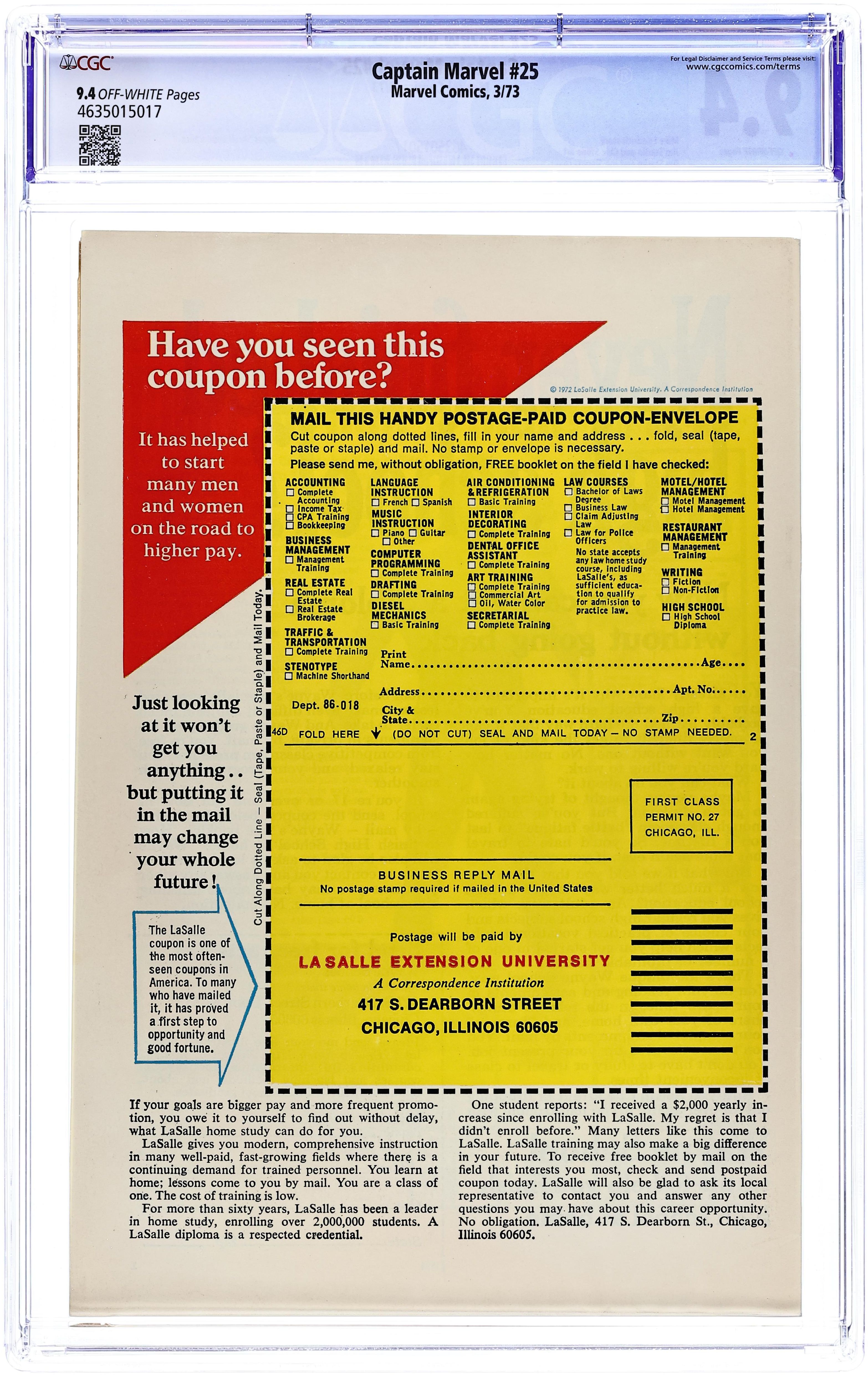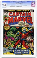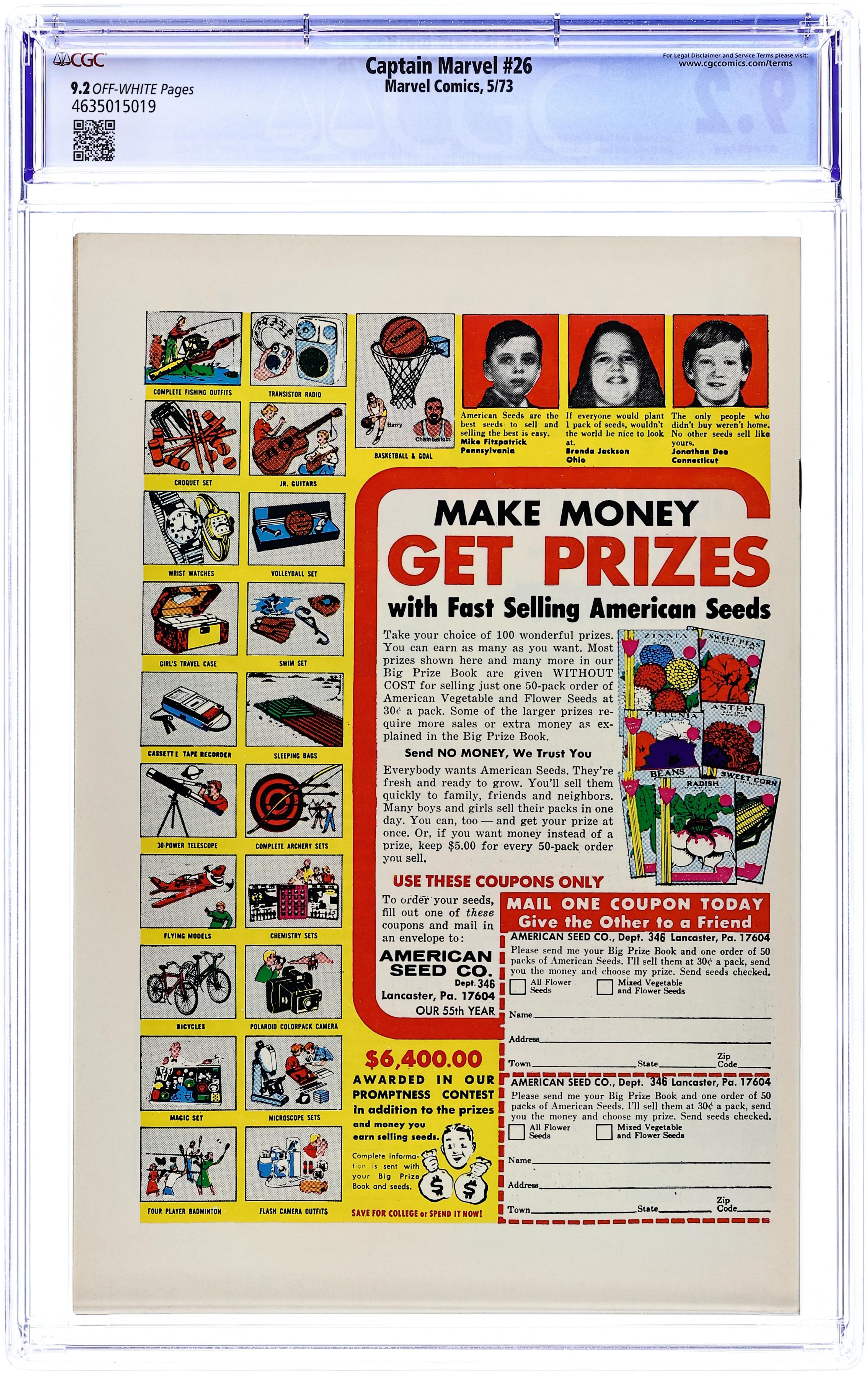 Cover pencils by Jim Starlin, inks by Joe Sinnott. Captain Marvel battles the Super-Skrull (in the guise of Ronan, Megaton, Yon-Rogg, the Hulk, and the Sub-Mariner) in "A Taste of Madness!", script by Mike Friedrich, pencils by Jim Starlin (first work on the series), inks by Chic Stone; In an elaborate scheme of the Skrulls and their mysterious Masterlord, Super-Skrull and Kl'rt, Rick Jones is framed for the murder of Dr. Benjamin Savannah and brought to a run-down police precinct; Using Super-Skrulls invisibility as well as other Skrull technology, Mar-Vell and Rick are led to believe that many of his long-time friends and foes have returned and are attacking him; Rick and Mar-Vell identify the ruse, and Mar-Vell attacks the Skrulls; The building collapses in the battle and the Skrulls escape. 36 pgs., full color. Cover price $0.20.