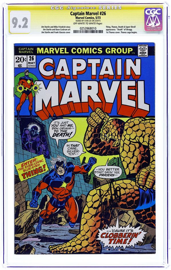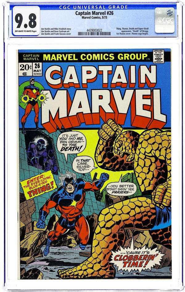 Cap battles the Thing (of the Fantastic Four) in "Betrayal!" Script by Mike Friedrich, plot and pencils by Jim Starlin, inks by Dave Cockrum. Second appearance of Thanos (2 pages). 1st appearance of Death with Thanos. Super-Skrull appearance. Letter to the editor from writer Michael Uslan. Starlin cover pencils. Cover price $0.20.