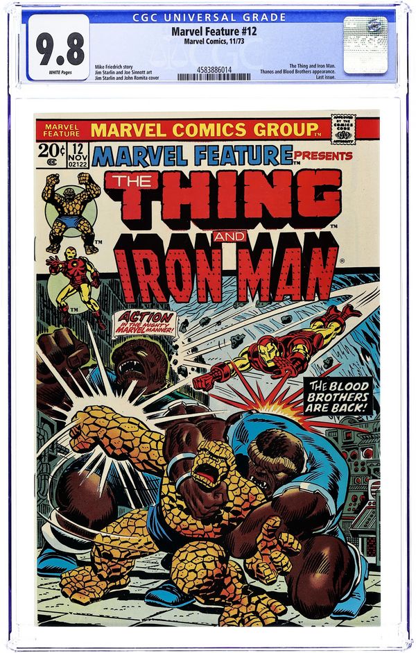 Starts Jan 3 "Beware the Blood Brothers!" First appearance of Thanos. Story by Jim Starlin. Art by Jim Starlin and Mike Esposito. Cover by Jim Starlin and Joe Sinnott. One of the landmark Marvel issues of the Bronze Age. Drax the Destroyer is a prisoner of Thanos at the evil Titan's Earth-fortress. In an effort to escape, Drax telepathically reaches out to Tony Stark for assistance; but before Iron Man can come to the rescue, Shell-Head is ambushed by the Blood Brothers! Can Drax and the golden avenger defeat the Blood Brothers and Thanos? Also first appearances of Drax the Destroyer, Starfox (in a flashback), and Mentor. (Note: Iron Man 55 was reprinted as a Marvel Milestone Edition in 1992.) 36 pages Cover price $0.20.