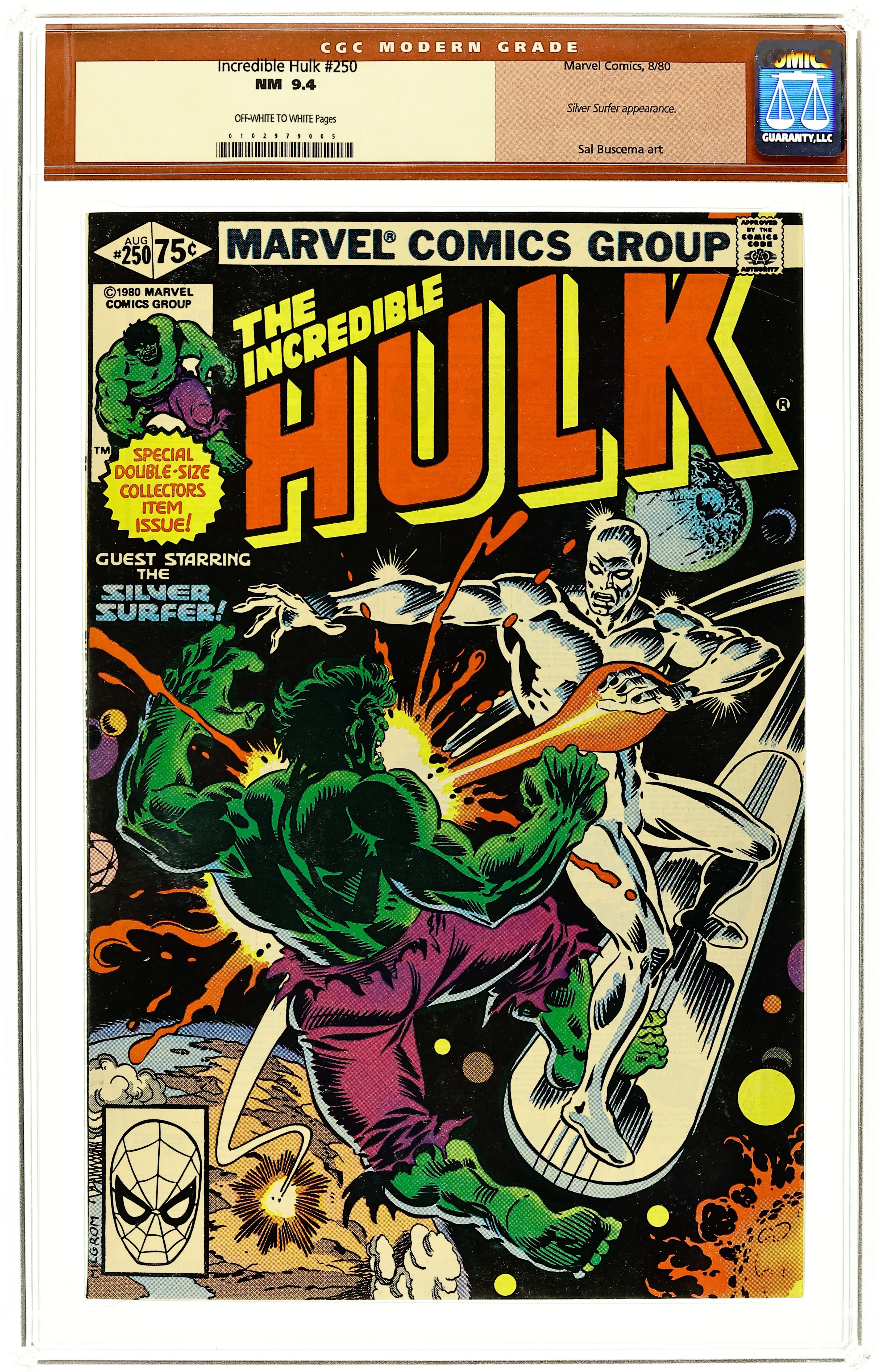 Direct Edition. Special giant-sized issue. Guest-starring Silver Surfer. A 250th celebration brought to you by Bill Mantlo and Sal Buscema. The Earth trembles when titans clash. It's the nigh unstoppable Incredible Hulk vs. the former Herald of Galactus, the Silver Surfer. Imprisoned on Earth by his former master, the Silver Surfer intends to add the immeasurable power of the Hulk to his own and break the barrier that keeps him from his home Zenn-La and his beloved. The only problem is, the Hulk has never been known for his generosity. 52 pages. Cover price $0.75.