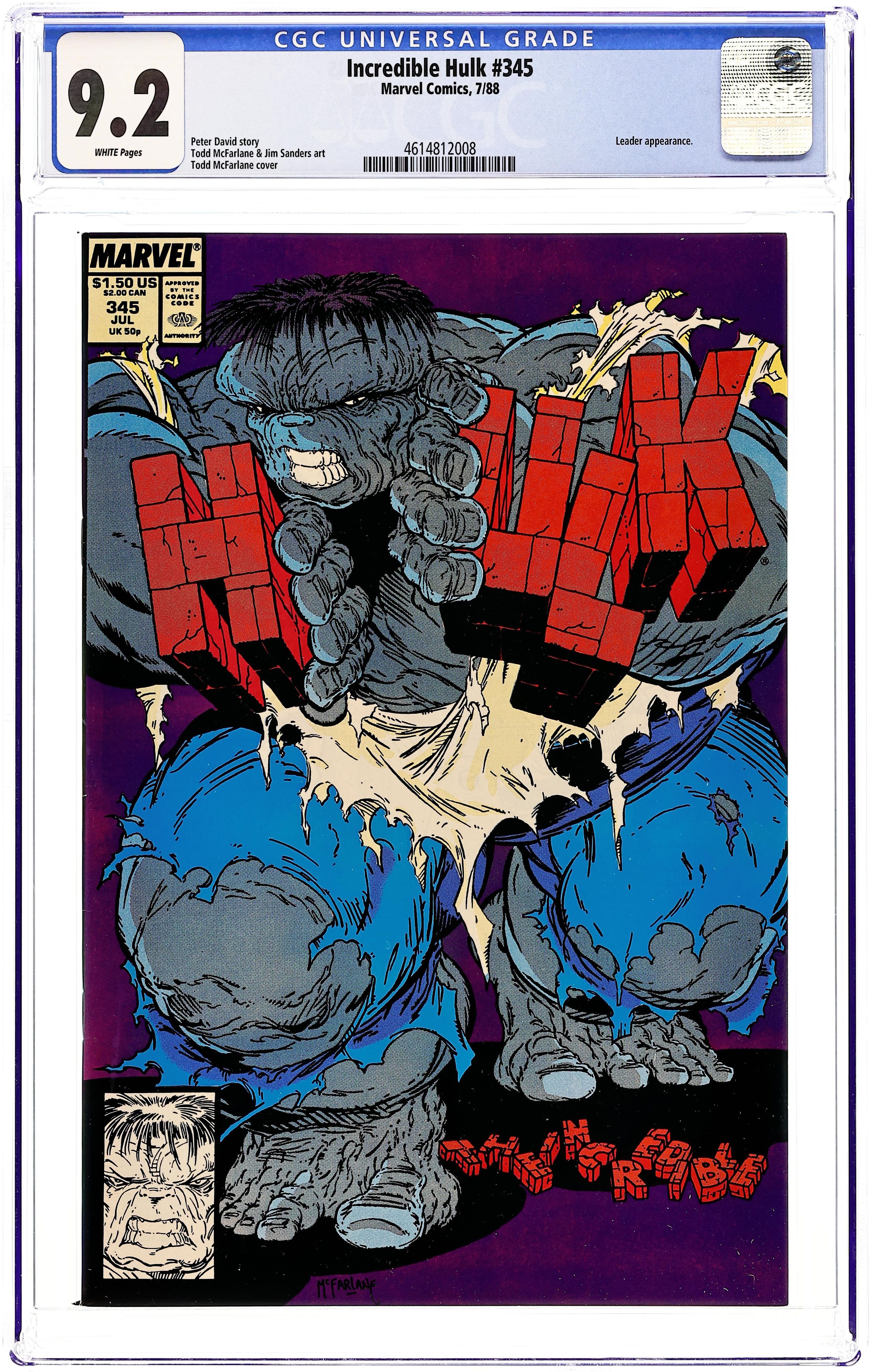 Direct Edition. Special extra-sized issue. "Turning Point!" Story by Peter David. Art by Todd McFarlane, Jim Sanders III, and Chris Ivy. The last two years have been building to this issue. Welcome to Middletown, a quiet little hamlet. It's citizens are like any other small town with aspirations and problems of their own. Enter: the Hulk. The Hulk and his companions have tracked down the Leader and the only thing standing in the Grey Behemoth's way is Redeemer and Rock, the super-powered former Hulkbusters. Witness the ultimate confrontation between the Hulk and one of his oldest enemies, and Middletown is caught in the middle. The ending of this one will absolutely shock you. 52 pages. Cover price $1.50.