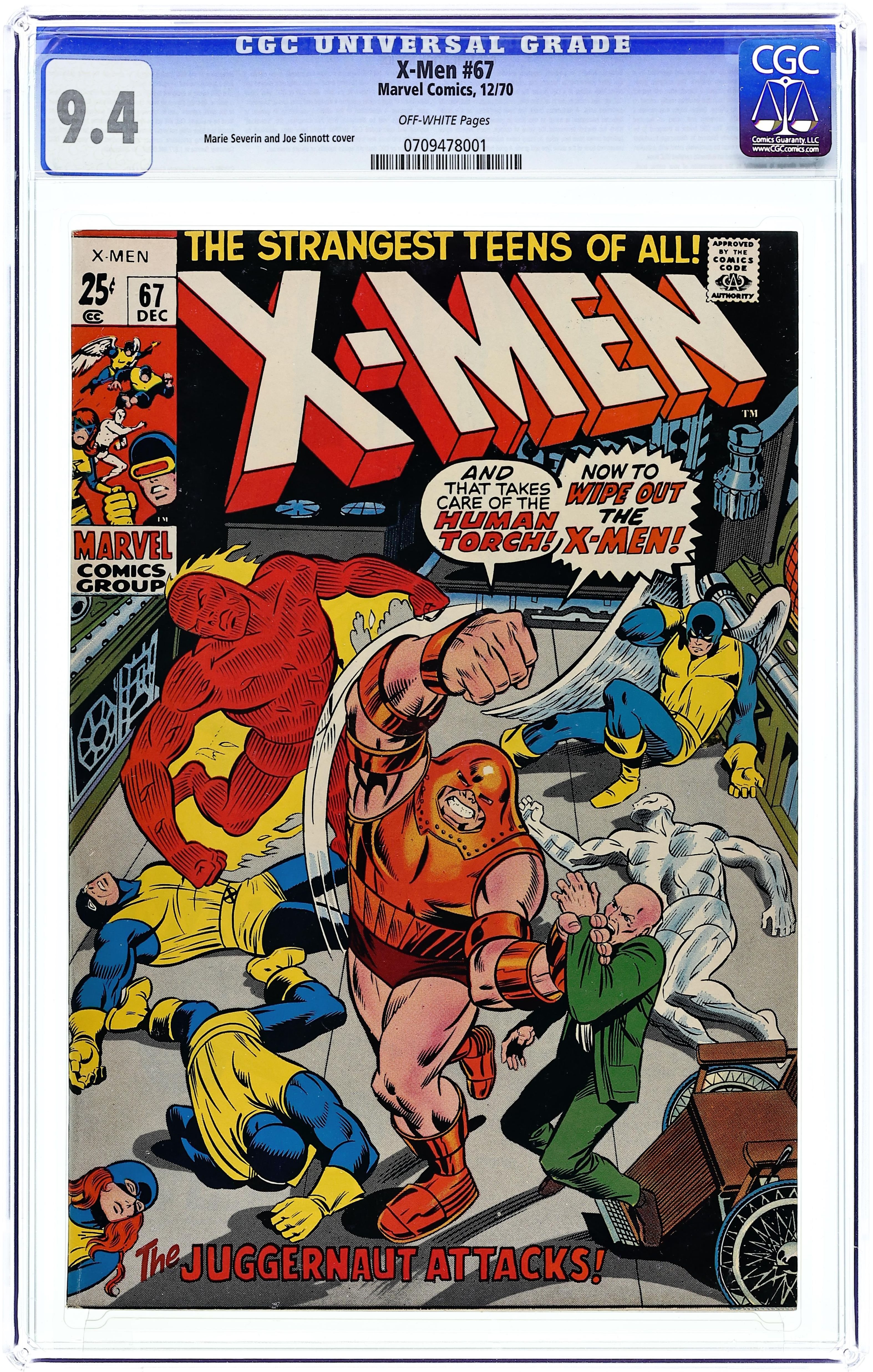 52-page Giant. Cover pencils by Marie Severin, inks by Joe Sinnott. The Origin of Professor X, script by Stan Lee, pencils by Jack Kirby and Alex Toth, inks by Vince Colletta; Cerebro detects a powerful mutant and Xavier fears that he knows who it is; The X-Men prepare the mansion for an all out assault; As the mysterious villain batters his way through the mansion's defenses, Professor X tells his students his origin story and how his step-brother changed from tormenting bully to an unstoppable Juggernaut; reprinted from issue 12. Where Walks the Juggernaut, script by Stan Lee, pencils by Jack Kirby and Werner Roth, inks by Joe Sinnott; reprinted from issue 13. 52 pgs. $0.25. Cover price $0.25.