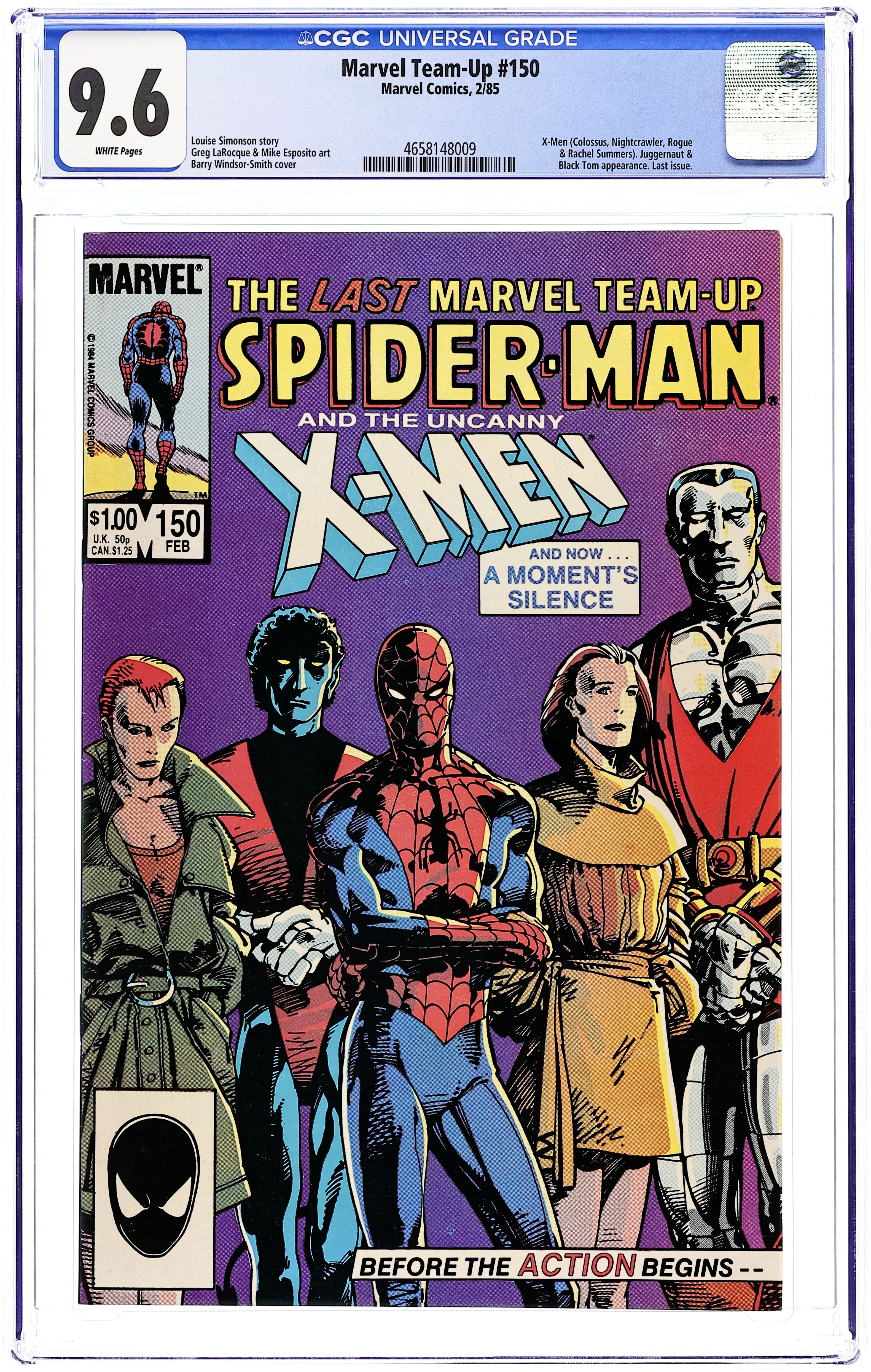 Direct Edition. Tis Better To Give!" Double-sized issue. Guest-starring Spider-Man and the X-Men. Script by Louise Simonson. Pencils by Greg LaRocque. Inks by Mike Esposito. Cover by Barry Windsor-Smith. It's the grand finale of the Marvel Team-Up series! Cain Marko has a wonderful birthday gift for his friend, Black Tom Cassidy: the awesome Ruby of Cyttorak! But Cain doesn't know that Tom's touching of the ruby will actually split the Juggernaut's power in two...and create a pair of half-powered juggernauts! When Black Tom and the Juggernaut realize what's happened, they decide to make the best of it...and trash the Spectacular Spider-Man! The wall-crawler needs help, perhaps some uncanny help, and he needs it fast! Auspiciously, the X-Men arrive on the scene! And the super showdown begins: Colossus, Nightcrawler, Rachel Summers, Rogue, and the amazing one vs. the twin juggernauts! (Notes: The web-slinger and the Juggernaut previously battled in Amazing Spider-Man 229 and 230. The Juggernaut appears next in Uncanny X-men 194. Beginning in April 1985, the Web of Spider-Man title replaced the bronze age Marvel Team-Up title as the third regular series for Spider-Man. This issue was reprinted in Marvel Tales 237 and 238.) 52 pages. Cover price $1.00.