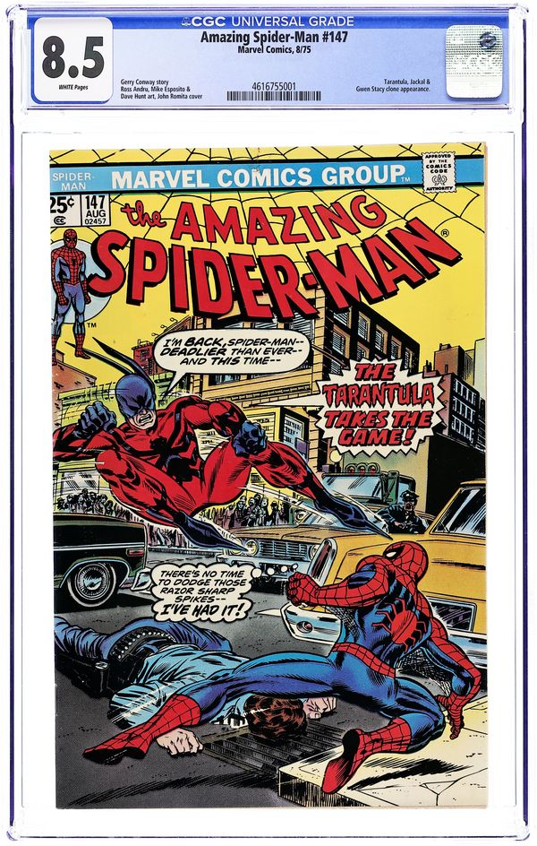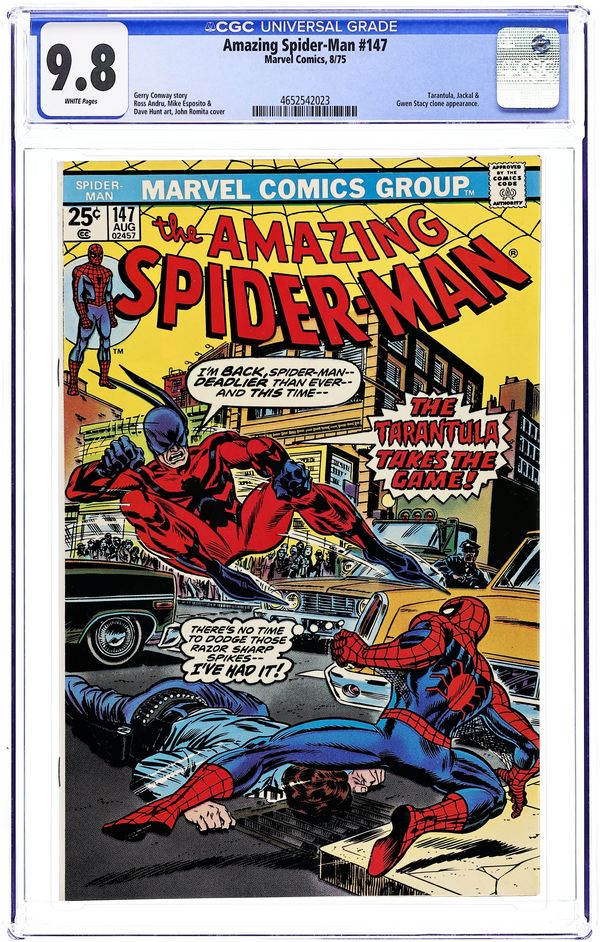 "The Tarantula is a Very Deadly Beast!" Script by Gerry Conway. Pencils by Ross Andru. Inks by Mike Esposito and Dave Hunt (backgrounds). Cover by John Romita Sr. Following his adventure in the Everglades (in Giant-Size Spider-Man 5), the wondrous wall-crawler returns to New York City! However everything is just as chaotic as when he left, thanks to the Gwen Stacy clone...and the Tarantula! The South American super-villain ambushes the spectacular one on the streets of Manhattan! And after a short skirmish, the Tarantula throws the web-slinger into a city bus! But this is no ordinary bus! For the driver is the Jackal...and the only passenger is Gwen Stacy! As for the bus' destination? Try the Brooklyn Bridge! Oh no, are the sins of the past coming back to haunt your friendly neighborhood Spider-Man? Cameo appearances by Mary Jane Watson, Ned Leeds, Aunt May, Anna Watson, and J. Jonah Jameson. Flashback cameo by Ben Parker. (Note: The Tarantula previously appeared in Amazing Spider-Man 135. The letters page includes Marvel Value Stamp series A #42 Man-Wolf by Gil Kane and Mike Esposito. This story was reprinted in Marvel Tales 124.) 36 pages. 25c cover price. Cover price $0.25.
