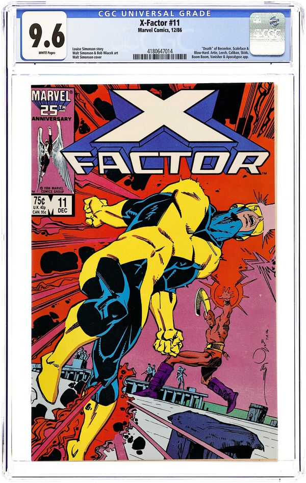 "Whose Death is it, Anyway?" Story by Louise Simonson. Art by Walter Simonson and Bob Wiacek. Due to injuries received in battle with the Marauders (see X-Factor (1986-1998 1st Series) #10 and Thor (1st Series) #373-374), Warren Worthington's wings have been amputated. He is the high-flying Angel no more. Faced with the reality that he will never fly again, will Warren give in to his grief? This is a tragic chapter in the lives of the original X-Men that will have lasting repercussions on X-Factor and the X-Men for years to come. Cover price $0.75.