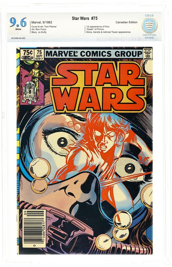 Canadian edition with $.75 cover price. Luke and Leia struggle to survive on Iskalon, while Lando, Chewie, Artoo and Threepio search for a droid on Gamandar in "Tidal". Script by Jo Duffy, layouts by Ron Frenz, inks by Tom Palmer. Frenz/Palmer cover. Cover price $0.75.