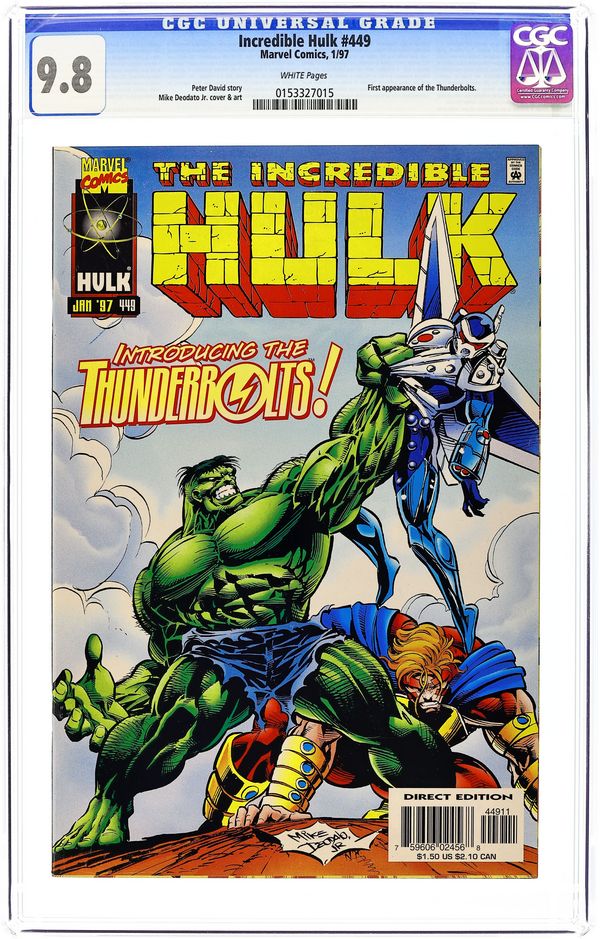 Direct Edition. Cover by Mike Deodato Jr. It's the first appearance of the Thunderbolts in the aptly-titled "Introducing the Thunderbolts," script by Peter David, pencils by Mike Deodato Jr., inks by Tom Wegrzyn; Hulk and Janis are attacked by the Thunderbolts; Hulk is hurt during the fight, and breaks the wall of a dam to switch their attention onto saving citizen lives; At the end of the issue we see the Hulk falling on his knees, grabbing his chest. Characters: Hulk (Bruce Banner); Thunderbolts (Citizen V; Mach-1; Songbird; Techno; Atlas; Meteorite) ; Janis Jones. 36 pgs., full color. $1.50. Cover price $1.50.
